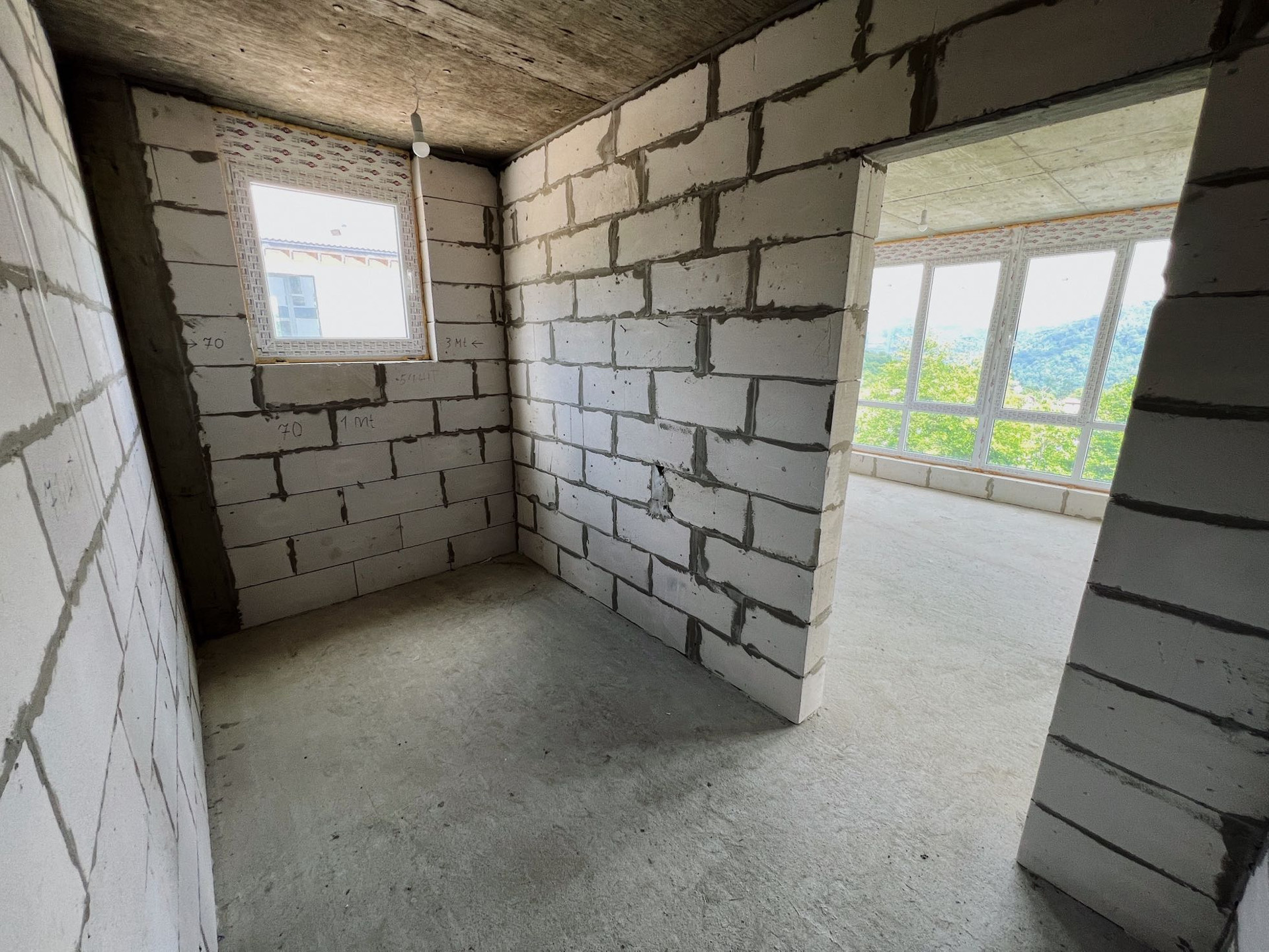 На 1 этаже - просторная кухня-гостиная с шикарным видом, гардеробная, кладовая, большой санузел. И на 2 этаже 2 спальни (у каждой великолепный вид из окна) и санузел.