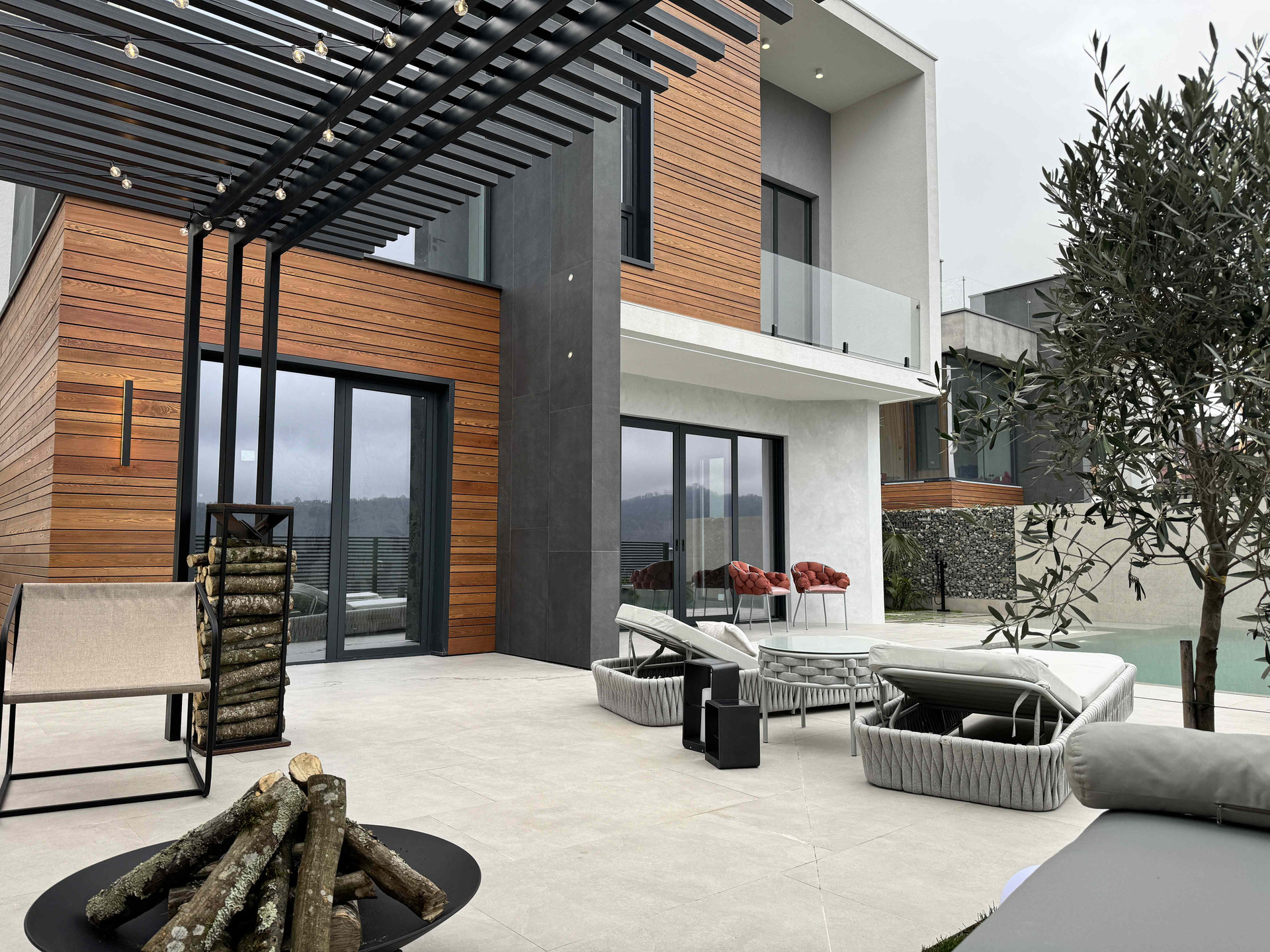Зона отдыха обустроена Костровой чашей и уличной мягкой мебелью с приятной системой охлаждения воздуха с помощью туманообразователя.