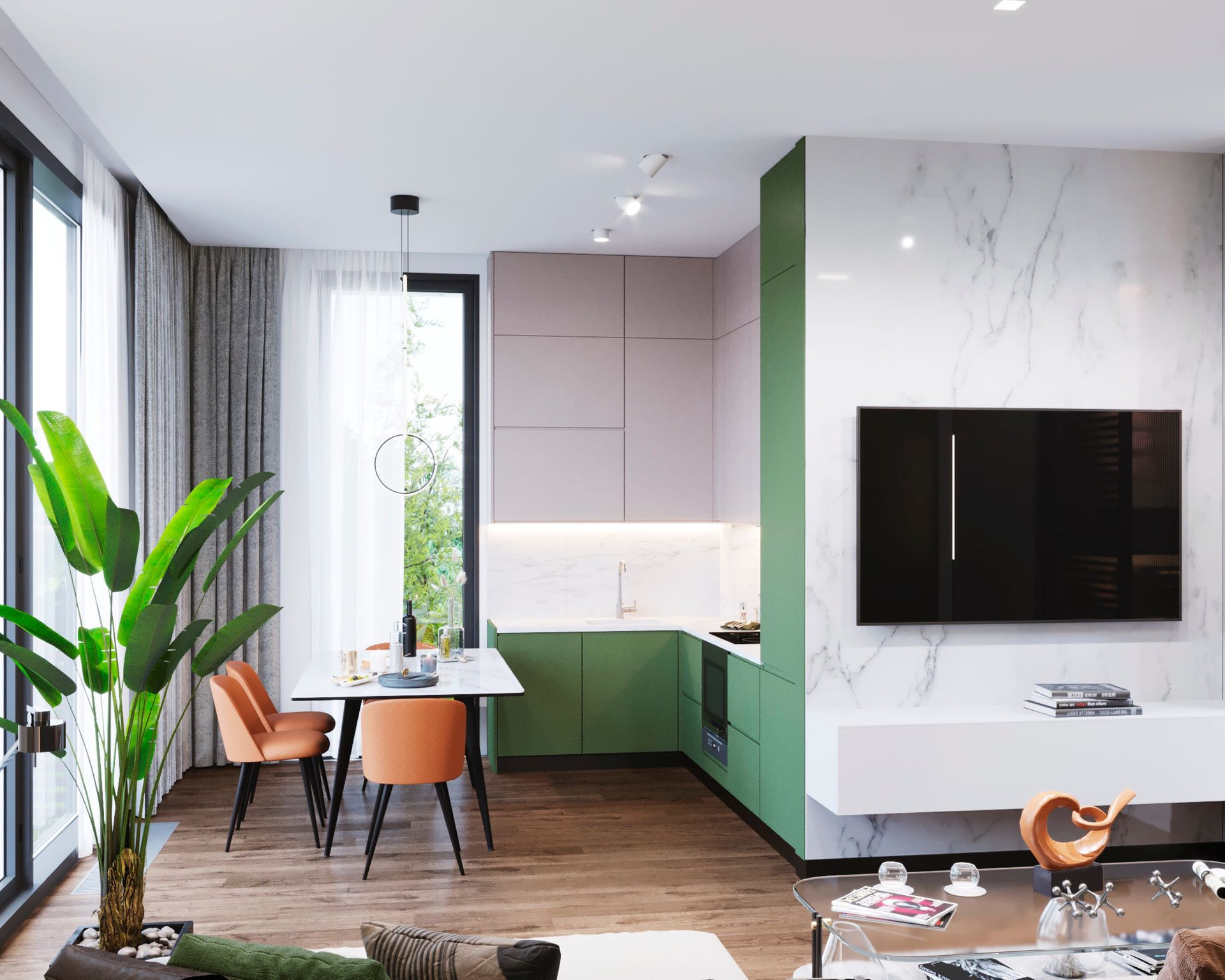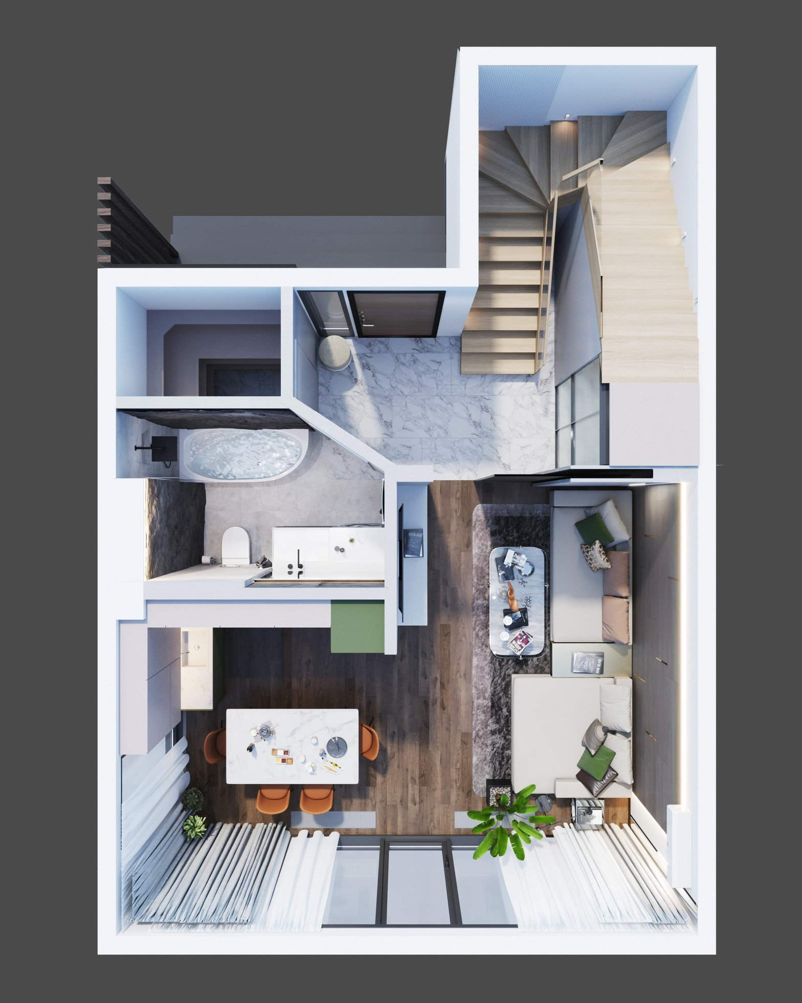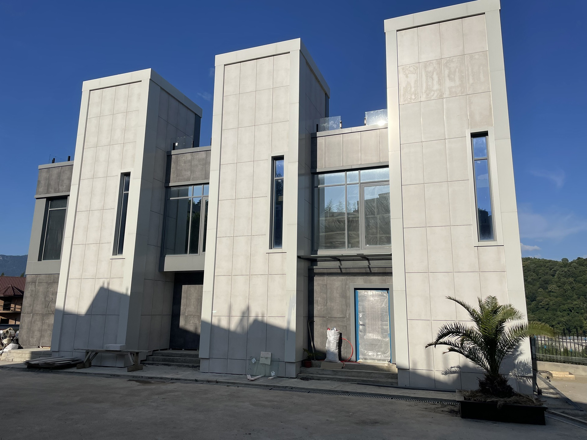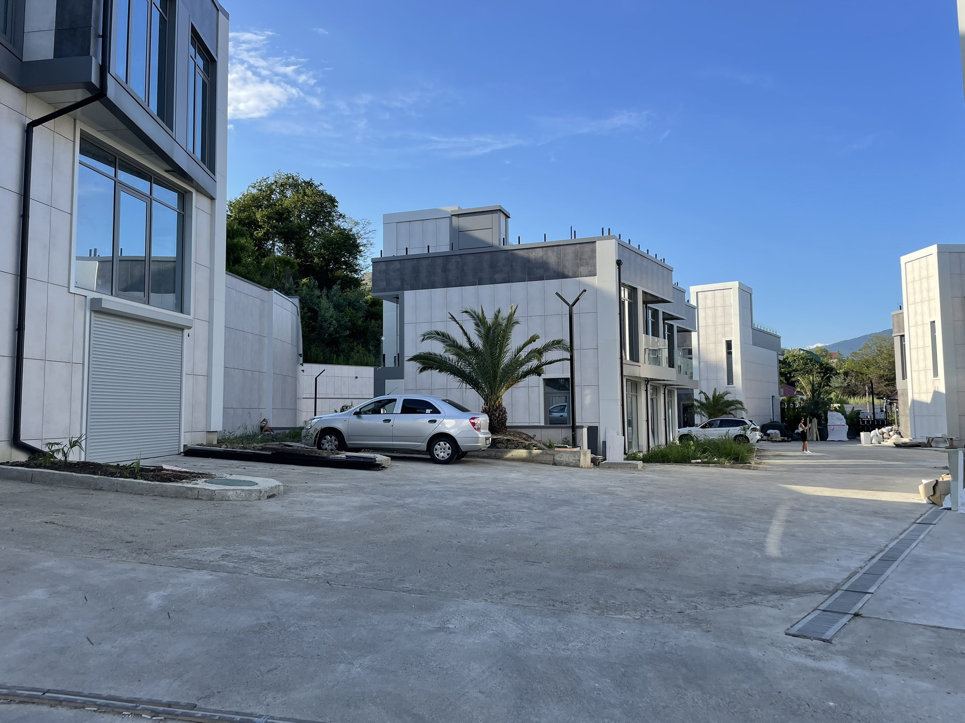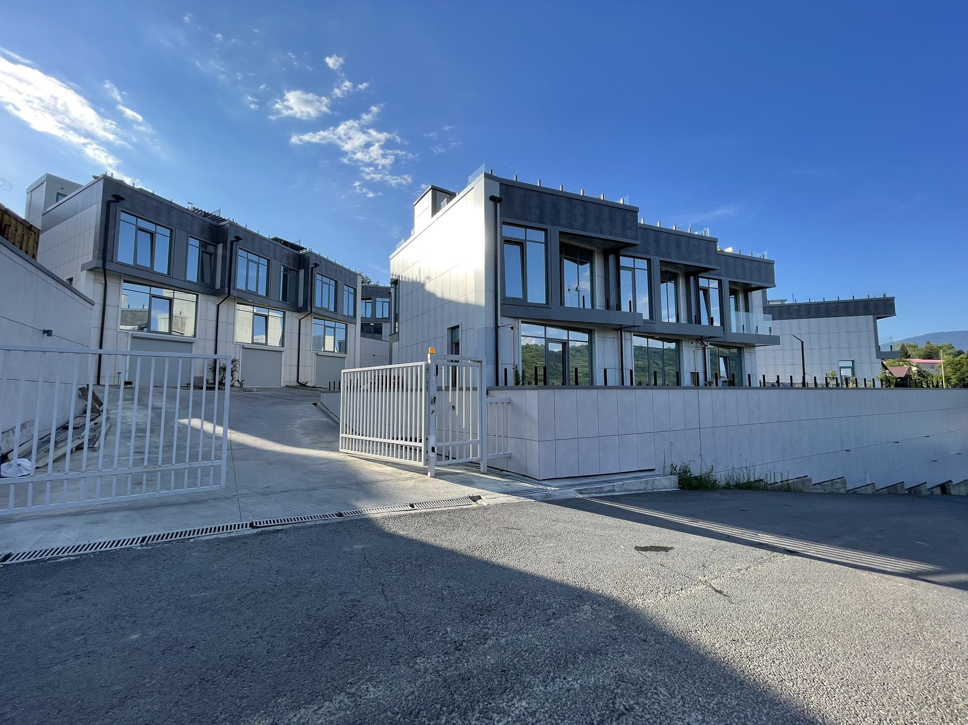 На закрытой территории расположились 27 таунхаусов, выполненные в современном стиле Хай-тек. Уже с придомовой территории открываются прекрасные виды на горы, а с эксплуатируемой кровли вид на горы и море.