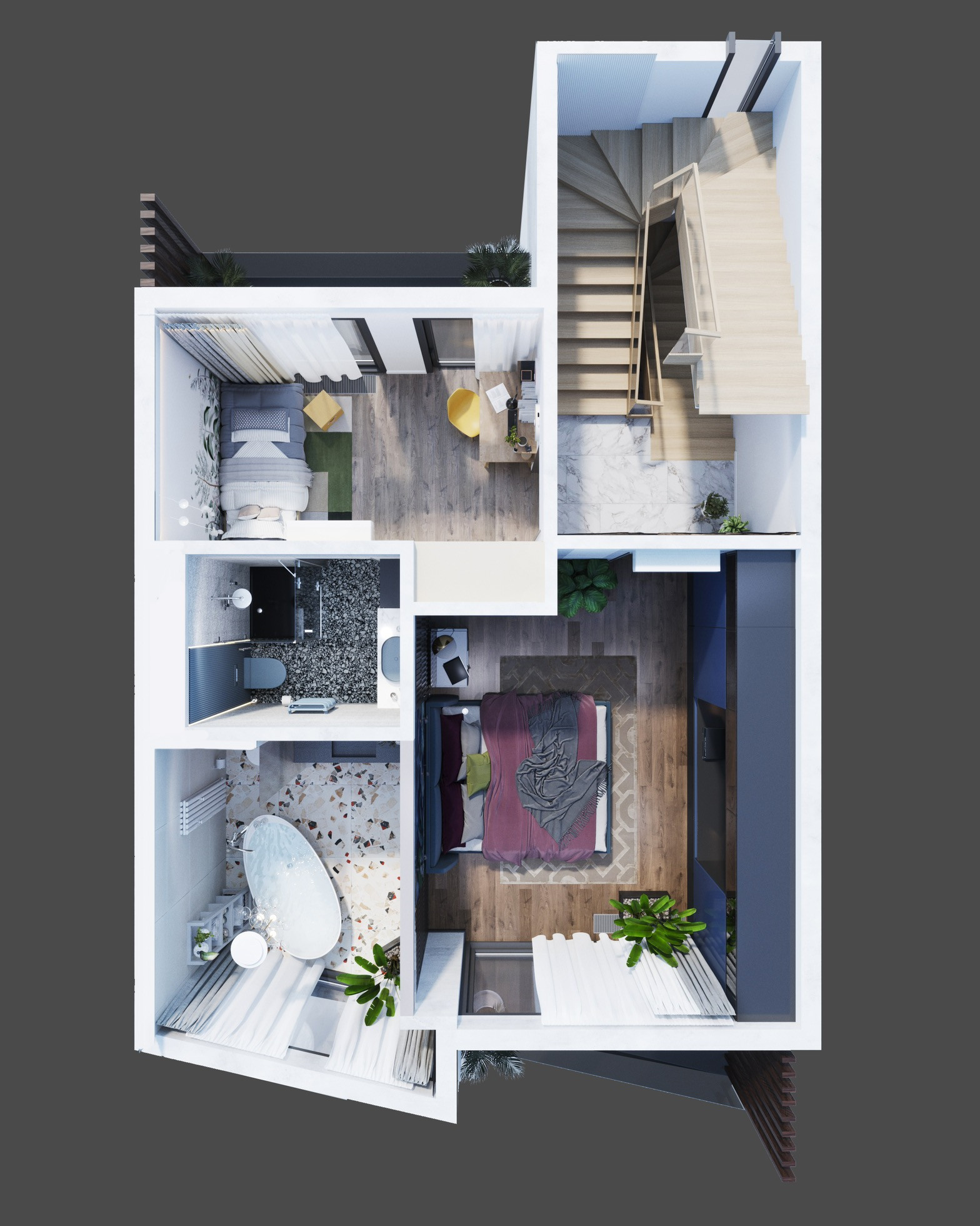 По проекту на первом этаже располагается кухня-гостиная с выходом на террасу, гостевой санузел, гардеробная; на втором этаже - 2 или 3 спальни и санузел, 3 этаж - эксплуатируемая кровля с джакузи и зоной барбекю.