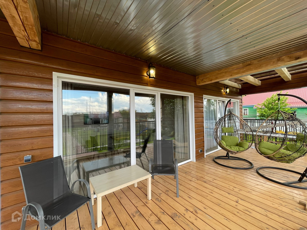 На первом этаже выходы сквозь витражные окна на террасу площадью 3*12 метров с подвесными креслами.