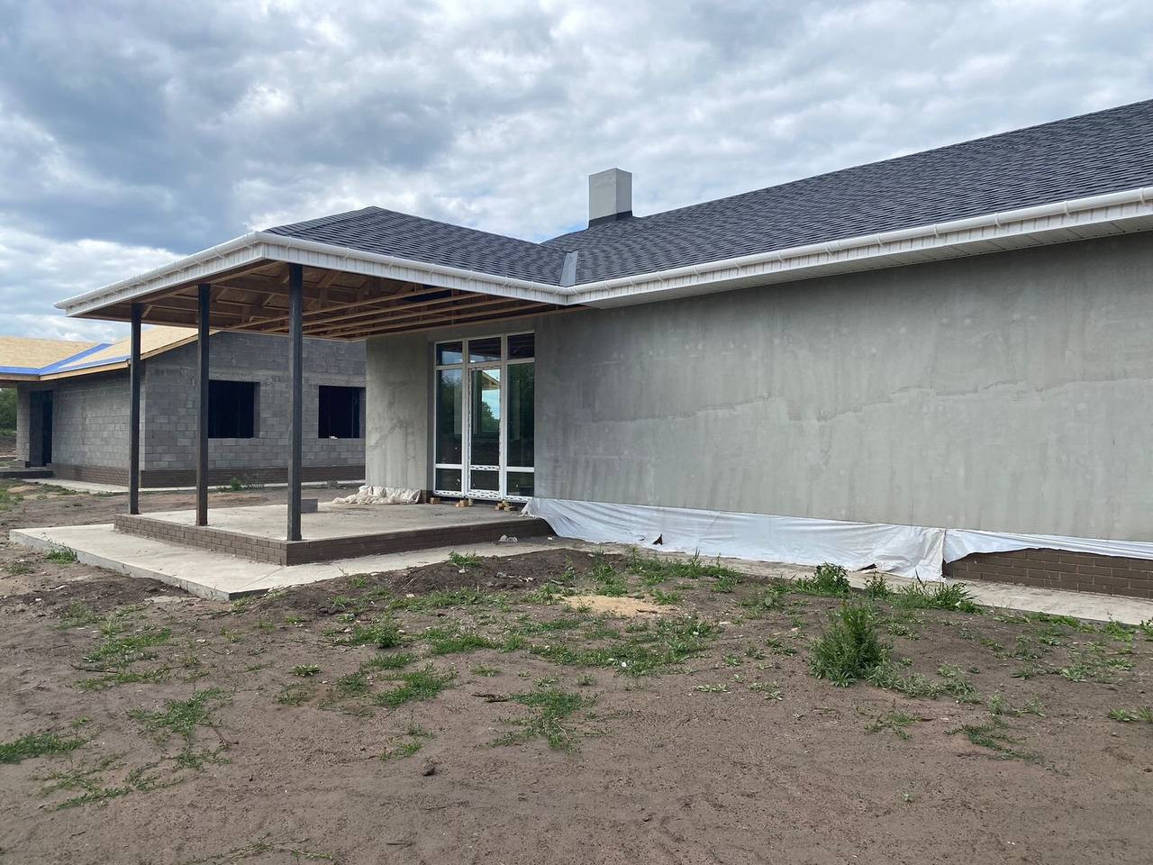 мягкая кровля, металлическая входная дверь, пластиковые окна, пред чистовая отделка, теплый пол, радиаторы отопления, отделка фасада, забор по периметру.