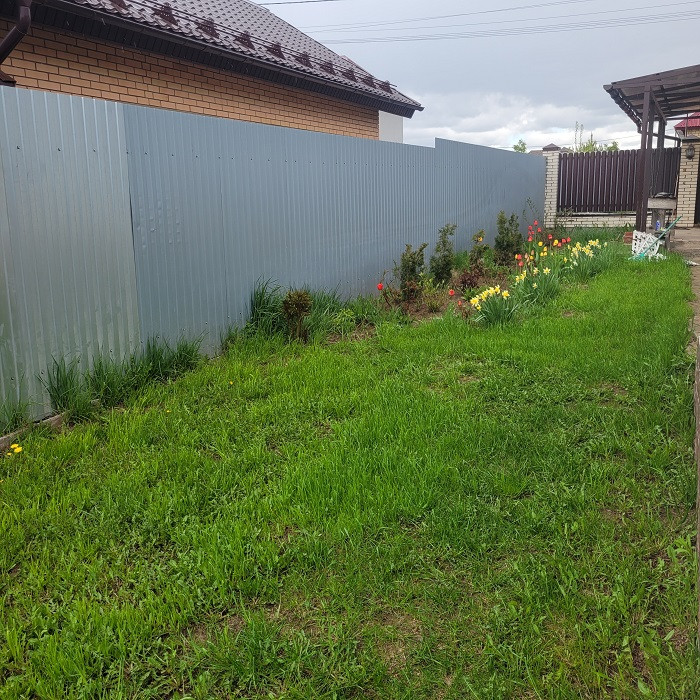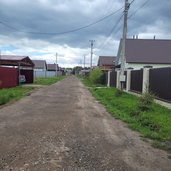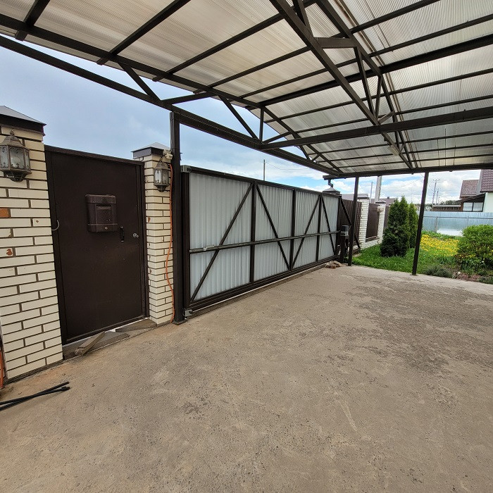 Участок ровный сухой, на территории есть помещение для хранения садового инвентаря. Крытая парковка на два автомобиля. Откатные ворота, есть второй въезд на участок. Вся территория огорожена забором.
