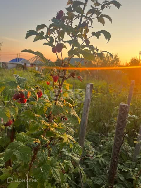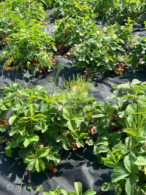 На участке посажены вишня, малина, клубника, яблоня.