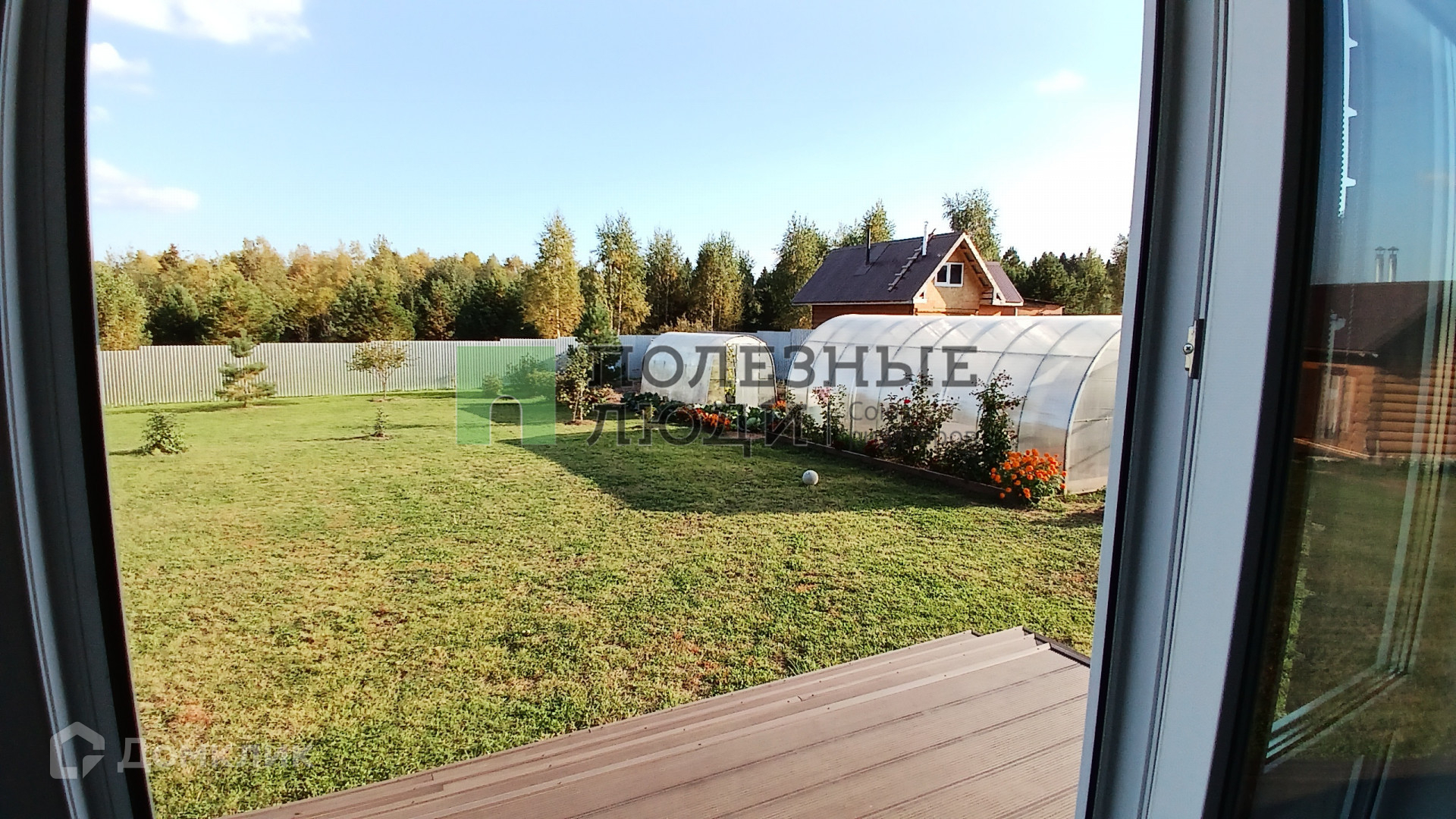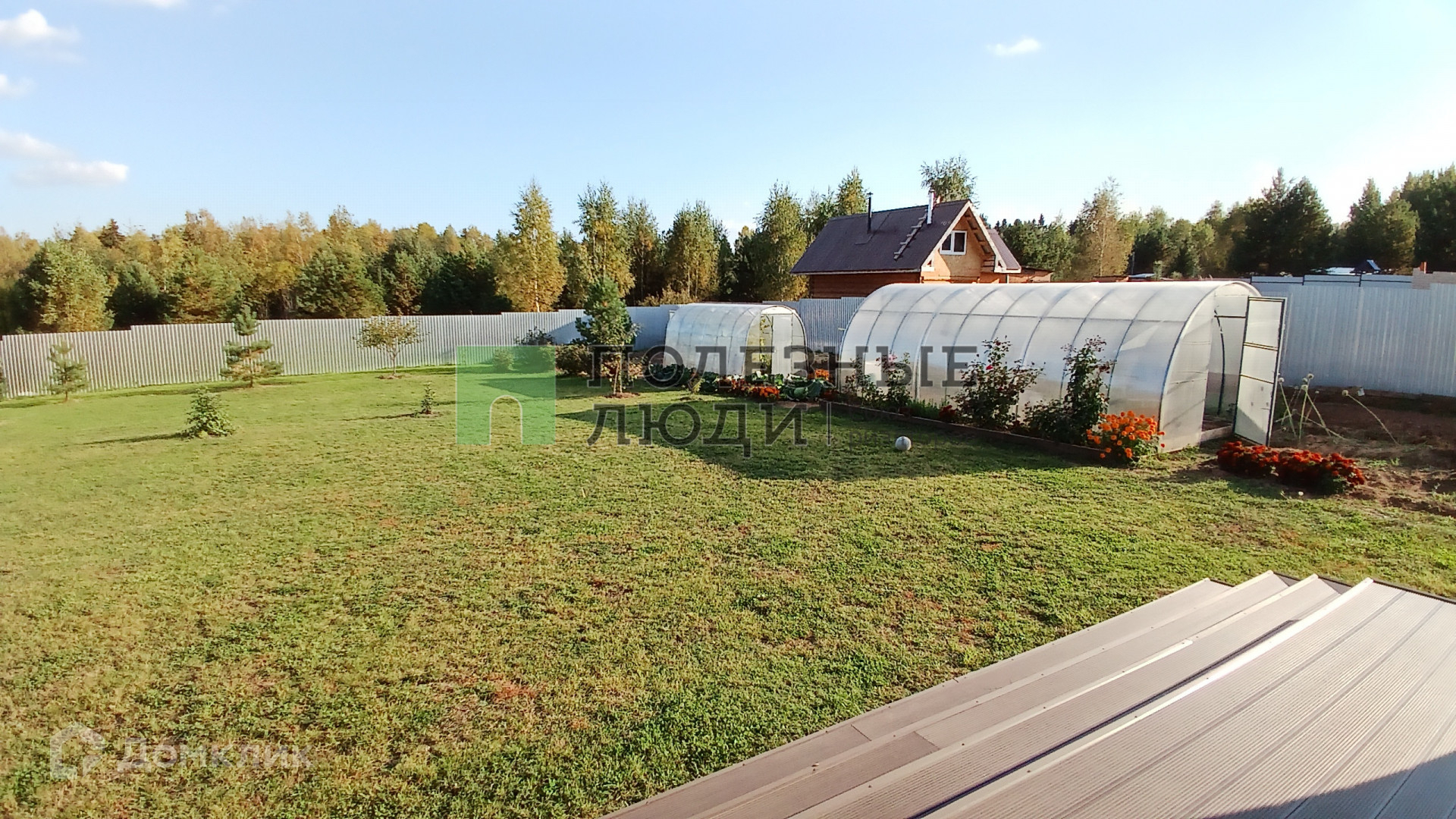 Участок покрыт газоном. Есть зона сада-огорода с теплицами, плодово-ягодными культурами, цветниками. На территории участка высажены хвойники.