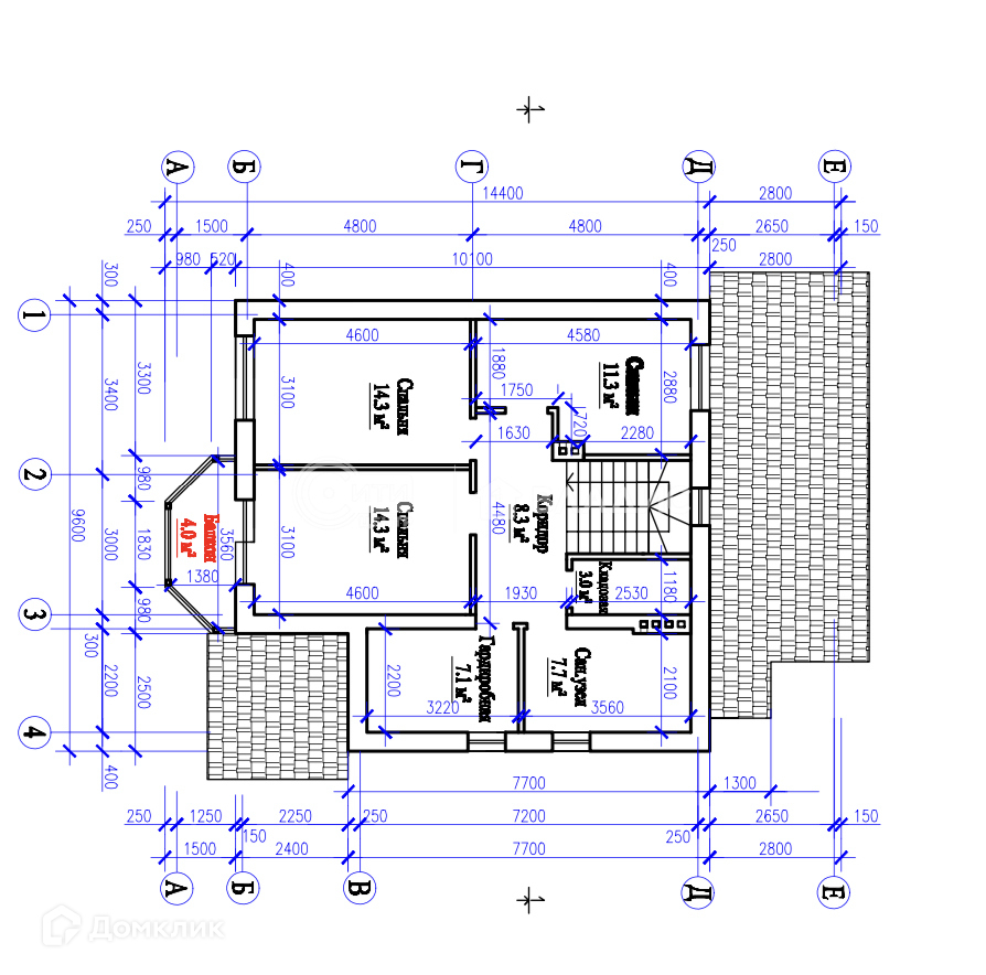 Стены: газосиликатные блоки 300 мм, утеплитель 100 мм, облицовка короед.