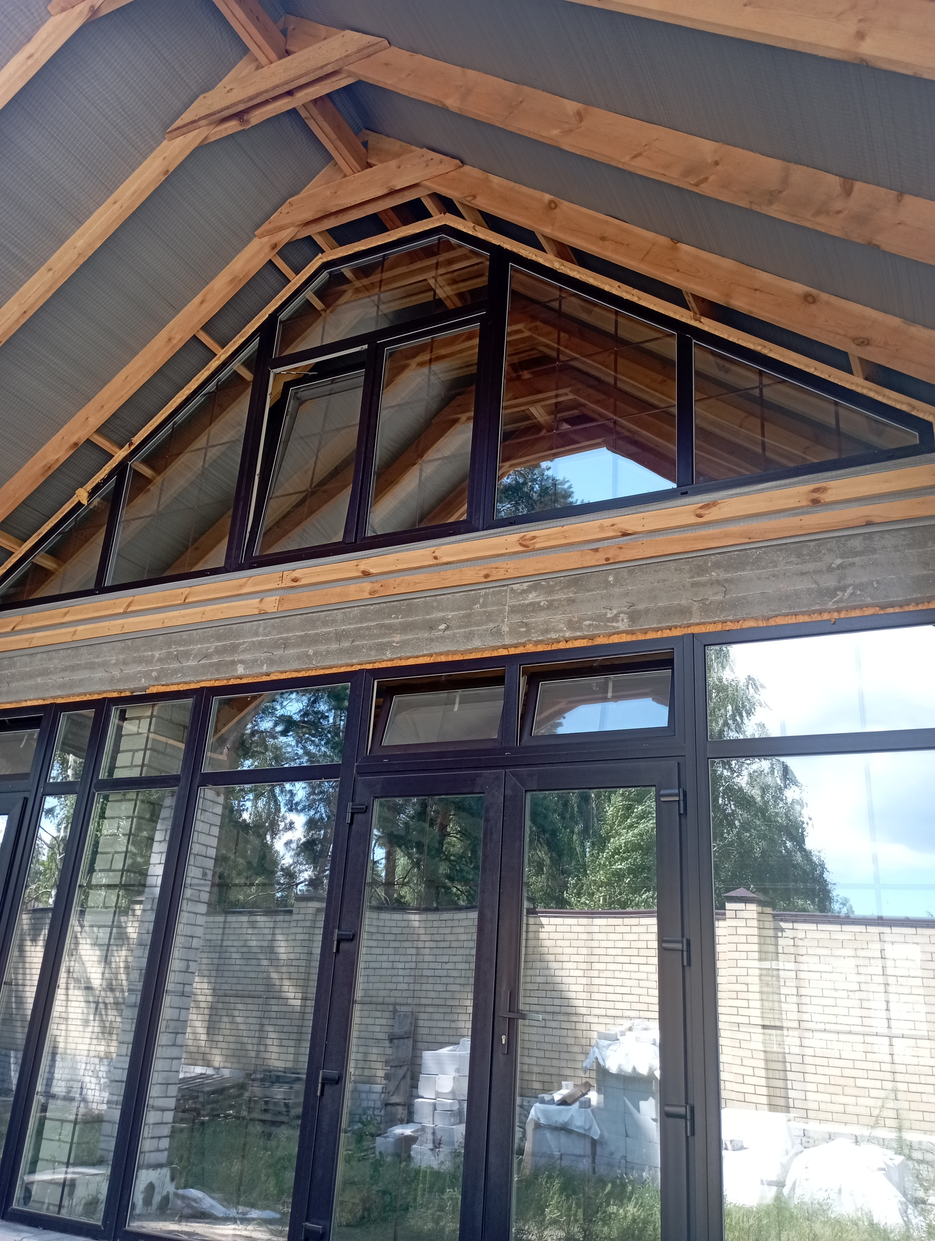 Большой витраж в кухне-гостиной и входная дверь, большие стеклопакеты. Монтаж оконных конструкций выполнен по ГОСТ.