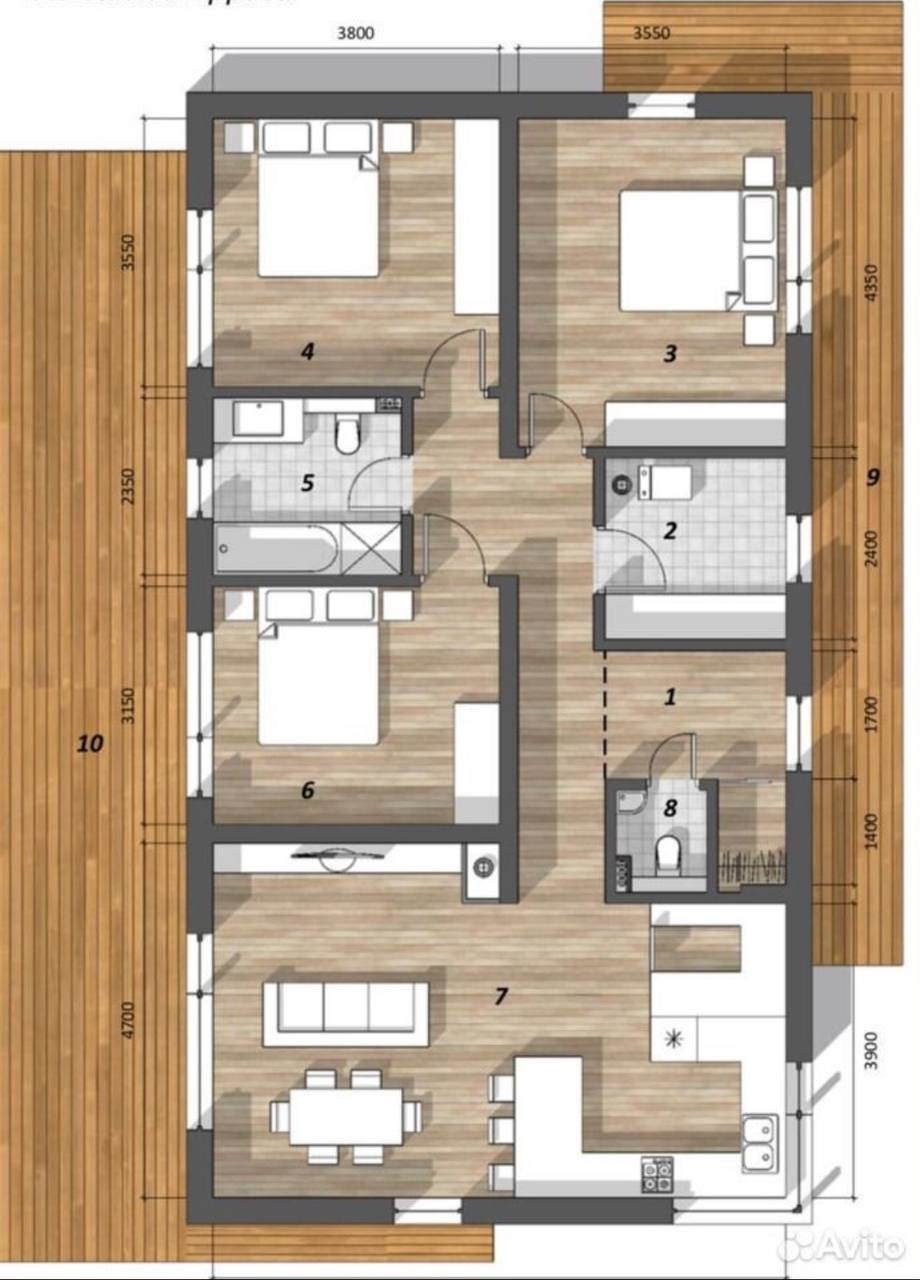 Удобная планировка: просторная кухня-гостиная, три спальни, два санузла, котельная-прачечная