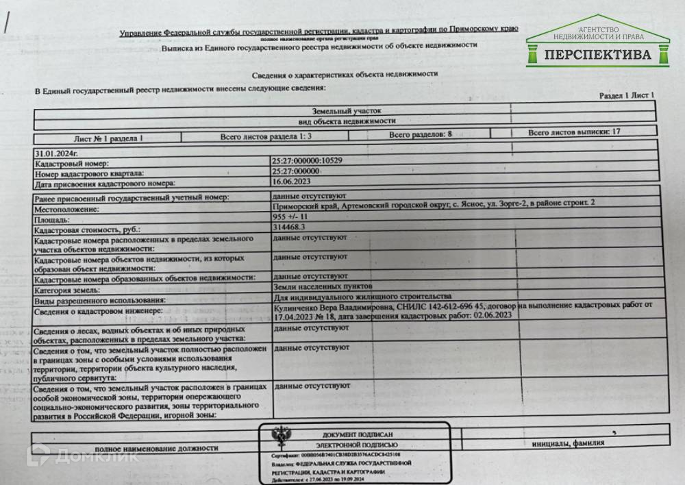 Агентство недвижимости "Перспектива" предлагает к продаже земельный участок  для строительства дома в с. Ясное г. Артема.