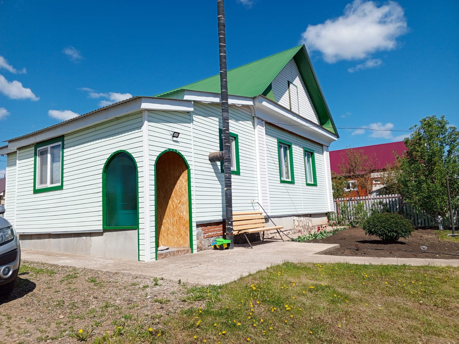 Дом из бревна, 2006 года постройки, обшит сайдингом, крыша и заборы профнастил.
