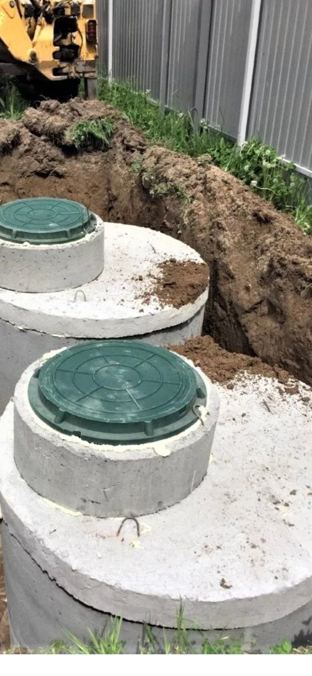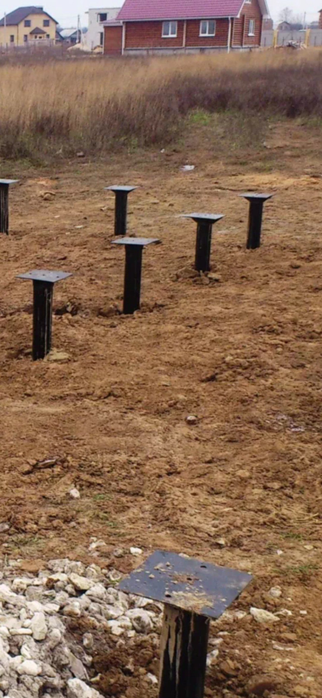 На участке свайный фундамент под Жилой дом, по проекту 8 х 8м + гараж. Сделан переливной септик (двухкамерный по три кольца).