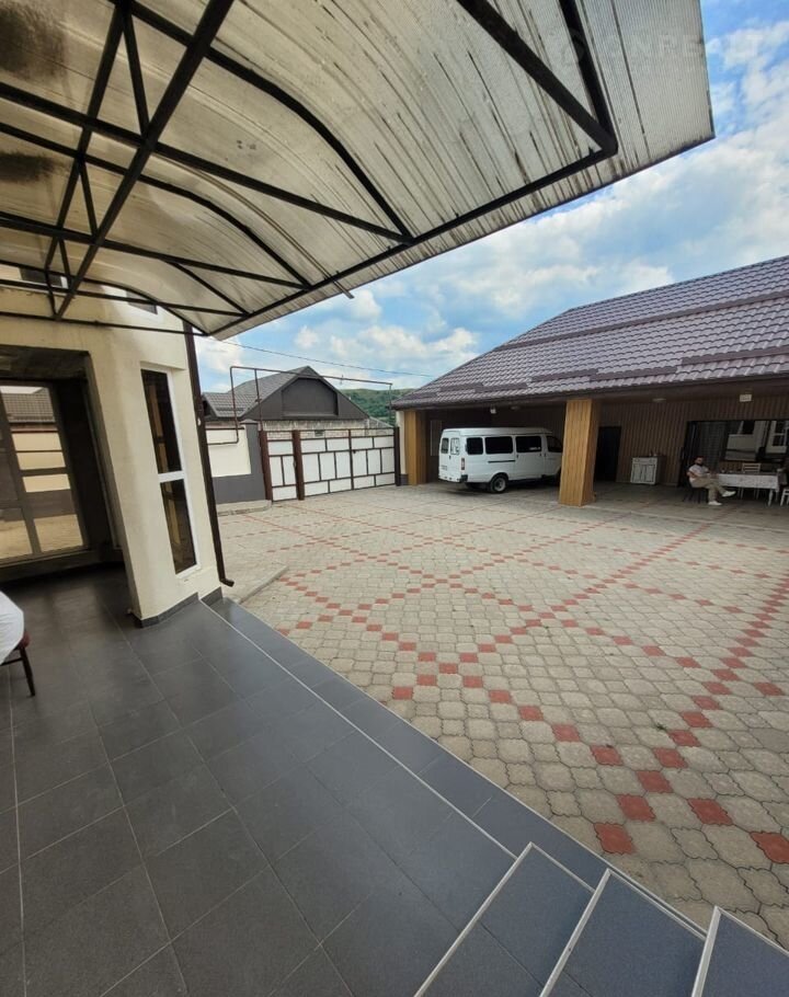 Перед кухней во дворе  большой крытый навес ,отделка навеса профнастил ,навес выложен плиткой ,что делает двор чистым и просторным .