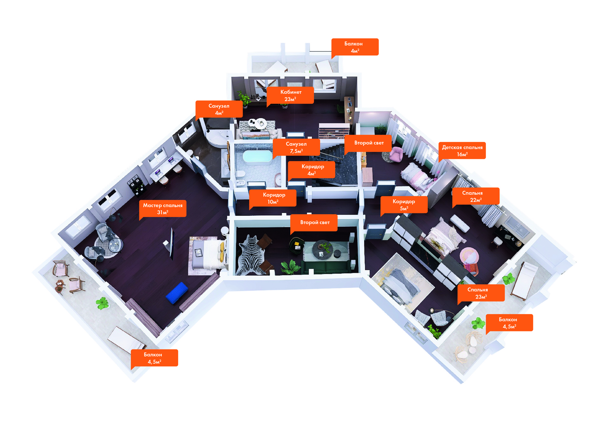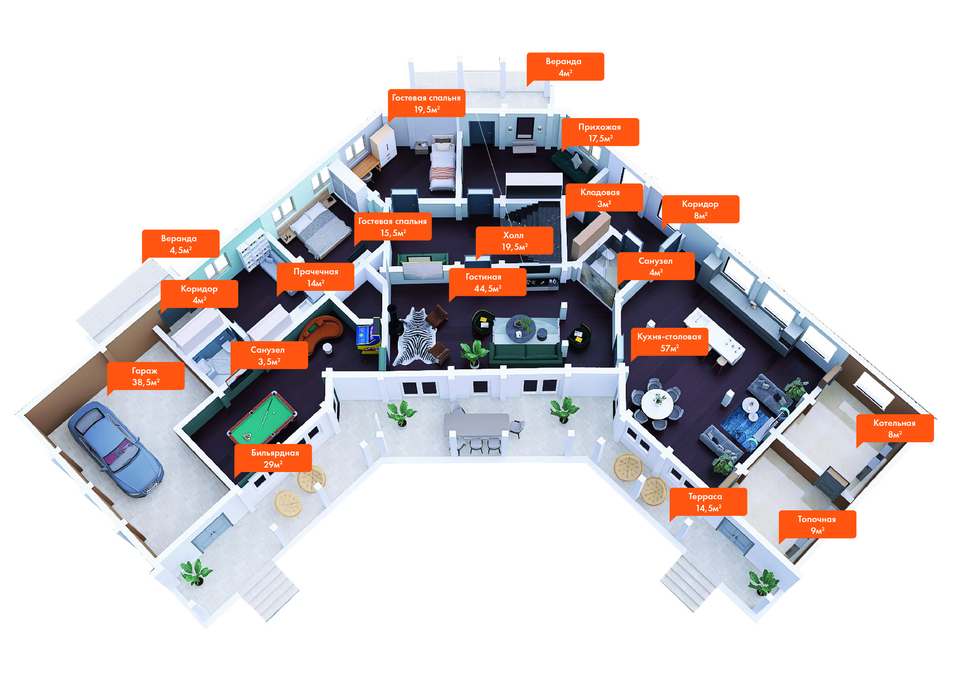 ✔️Основной дом выполнен по индивидуальному проекту. Площадь дома 588 м2, 3 этажа, гостиная со вторым светом 45 м2, кухня-столовая 57 м2, 10 просторных спален, в т.ч. огромная мастер-спальня (60 м2), 4 санузла, гараж 39 м2, терраса по всему фасаду, множество лоджий и балконов, высокие потолки.