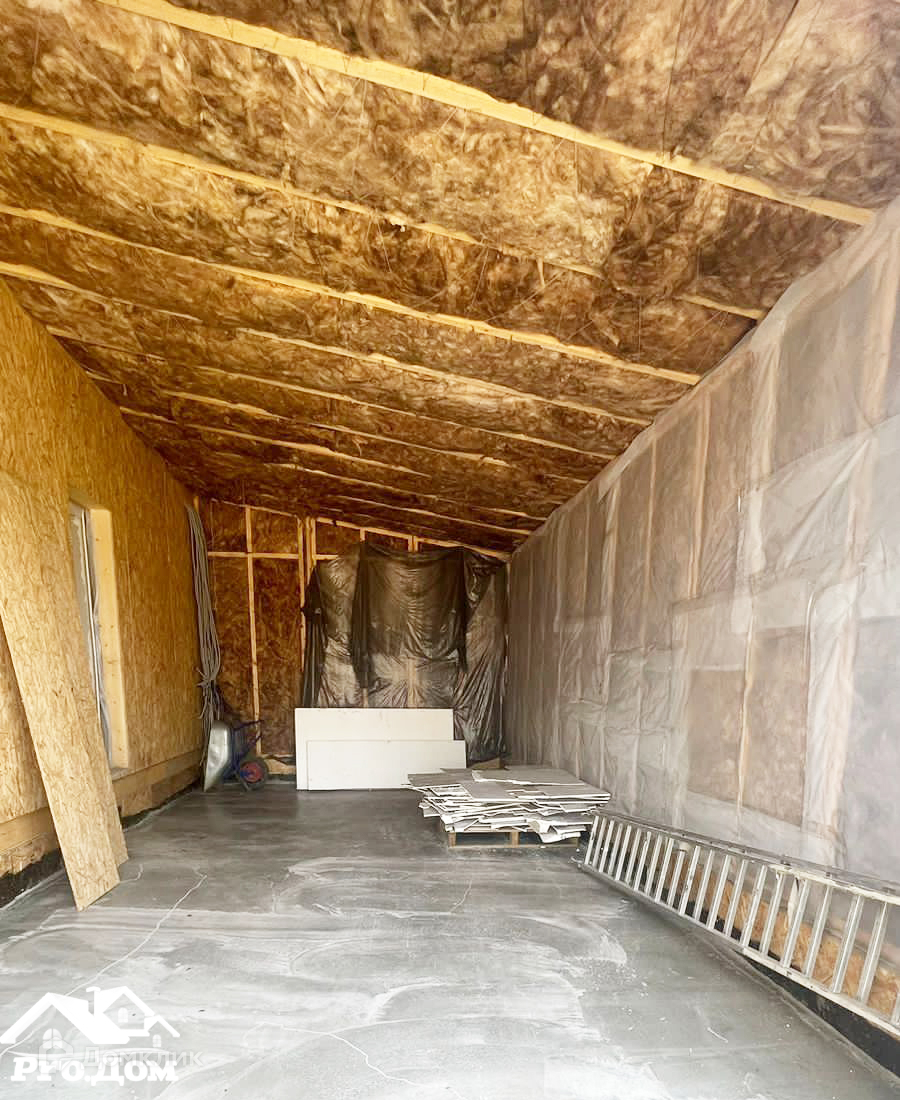 Утепление стен минеральная вата (наружных - 200мм, кровля 200 мм), внутренняя отделка: стены обшиты гипсокартоном, произведена подготовка стен под обои.