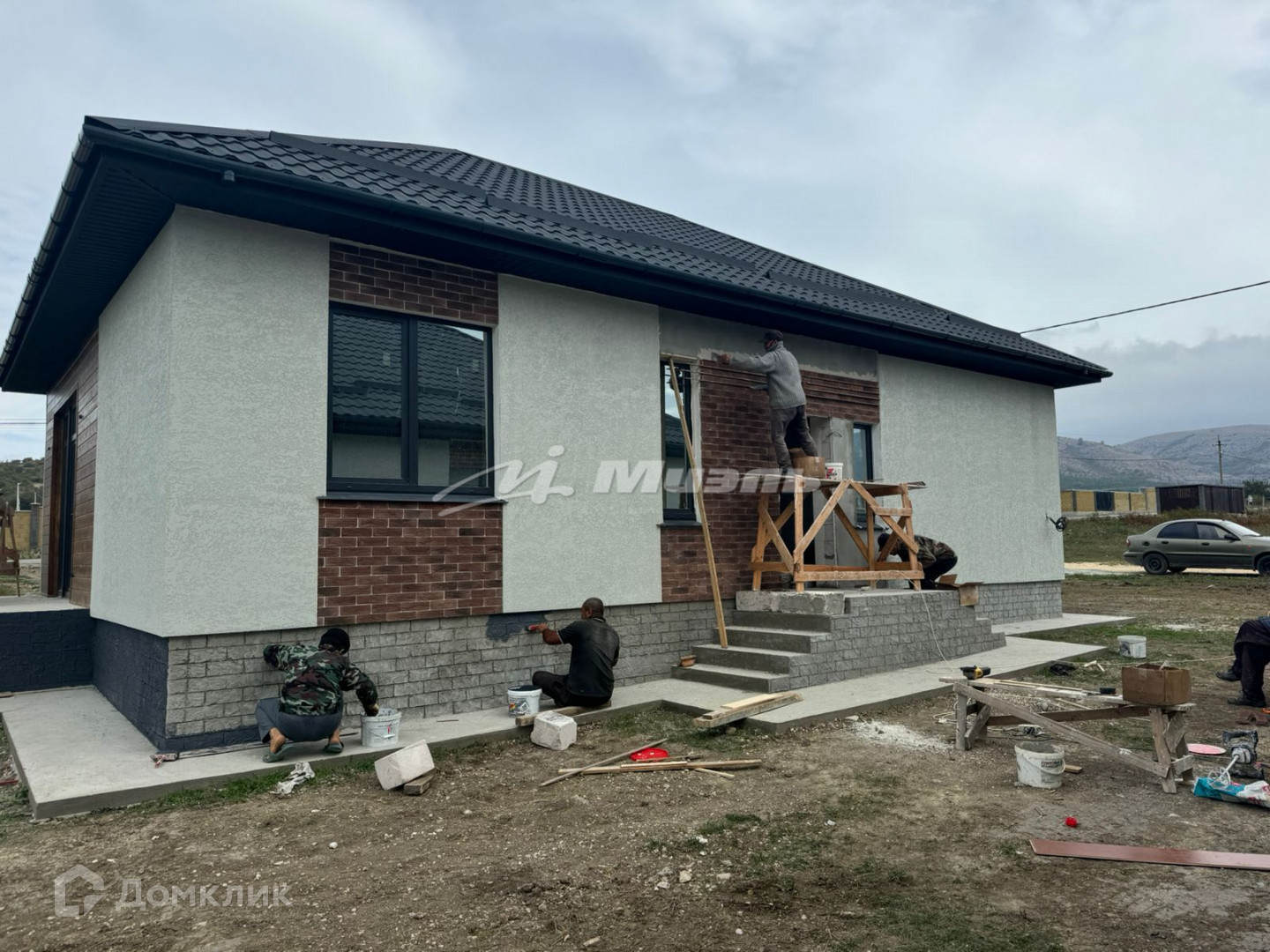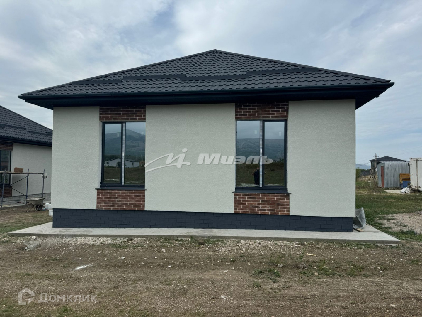 Крыша метало- черепица графит, матовая, есть забор, откатные ворота.