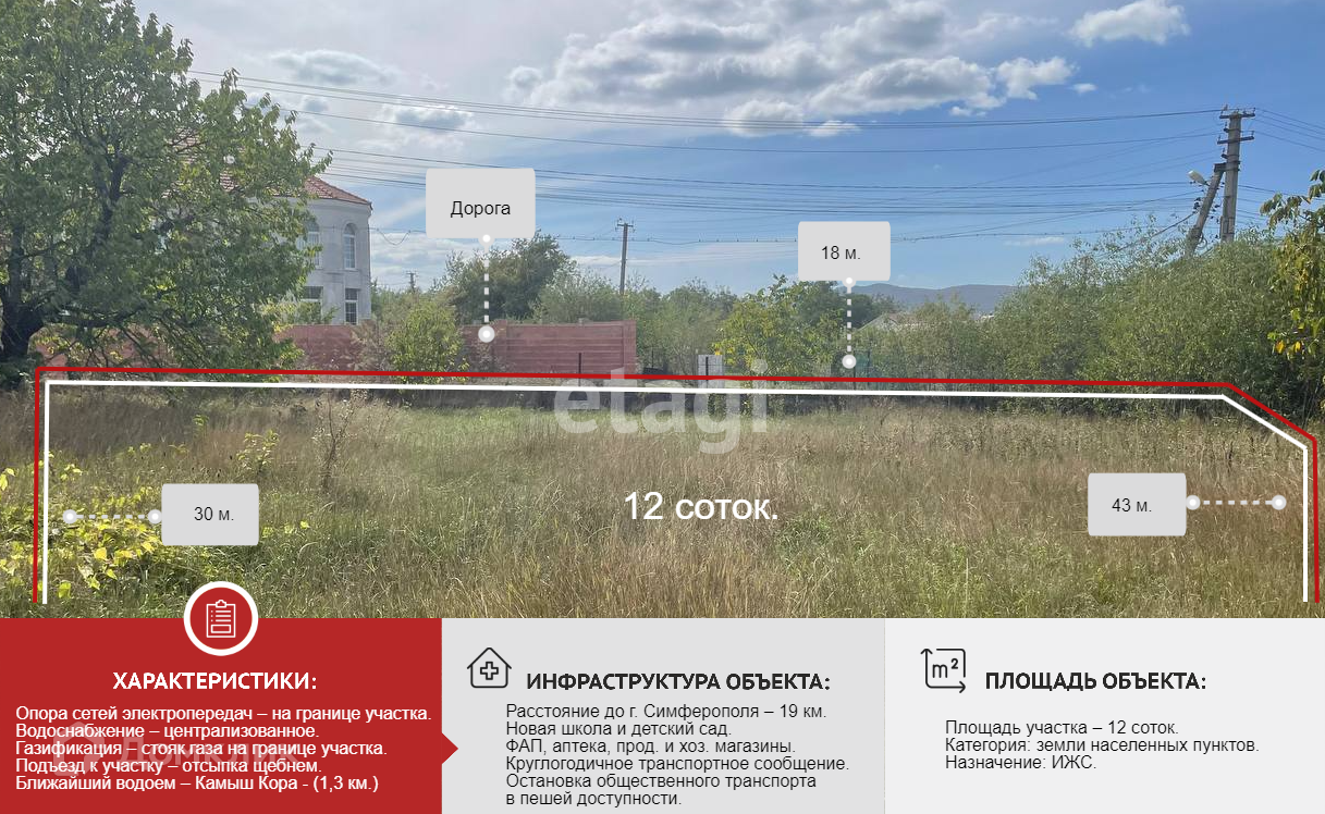 Инфраструктура села развита: новая современная школа и детский сад (5 минут пешком от участка), продовольственные и хозяйственные магазины, аптека, остановка общественного транспорта в пешей доступности (осуществляется круглогодичное транспортное сообщение, маршрутные такси и троллейбусы пригородных и междугородних направлений ходят по расписанию).