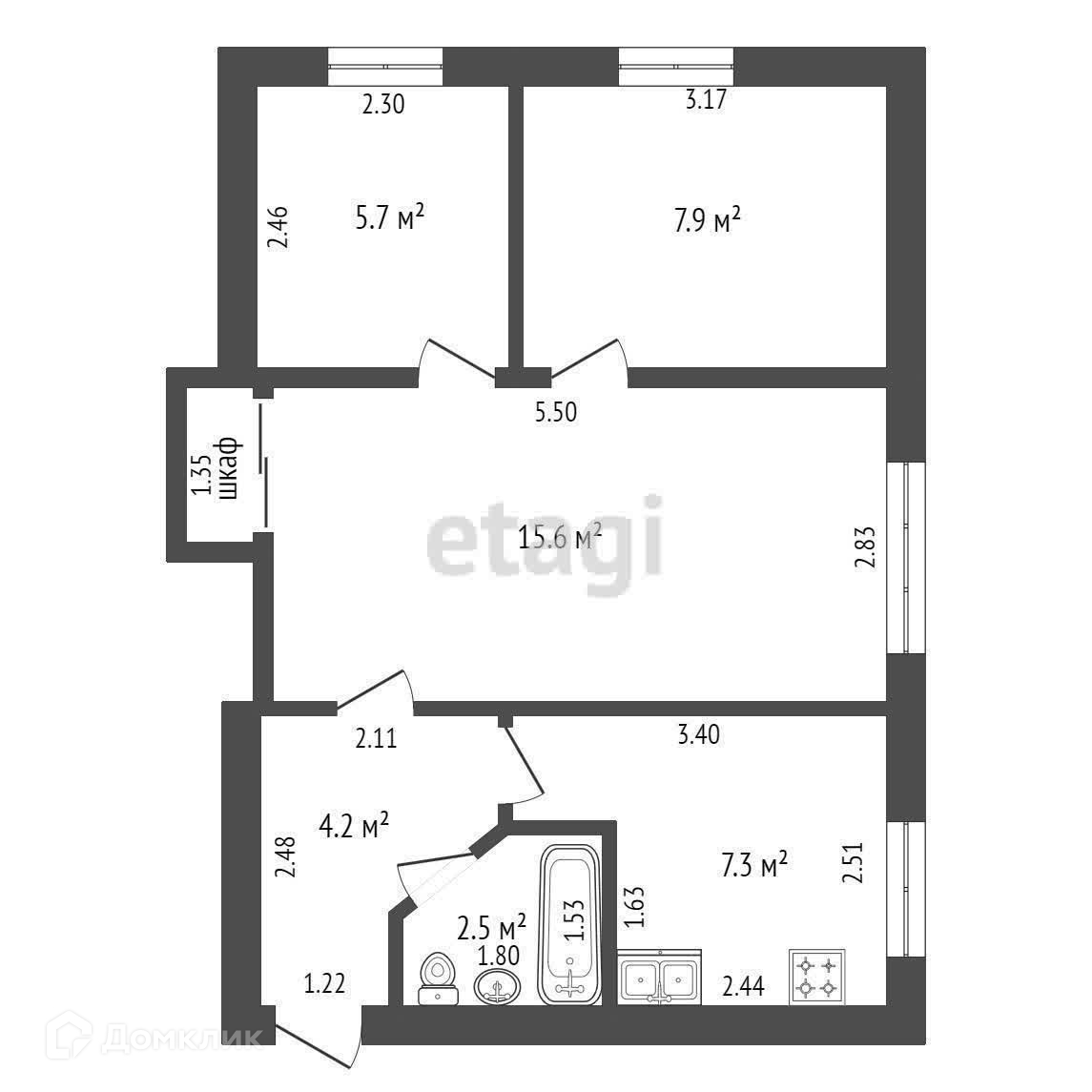 Общая площадь 42.3 м2