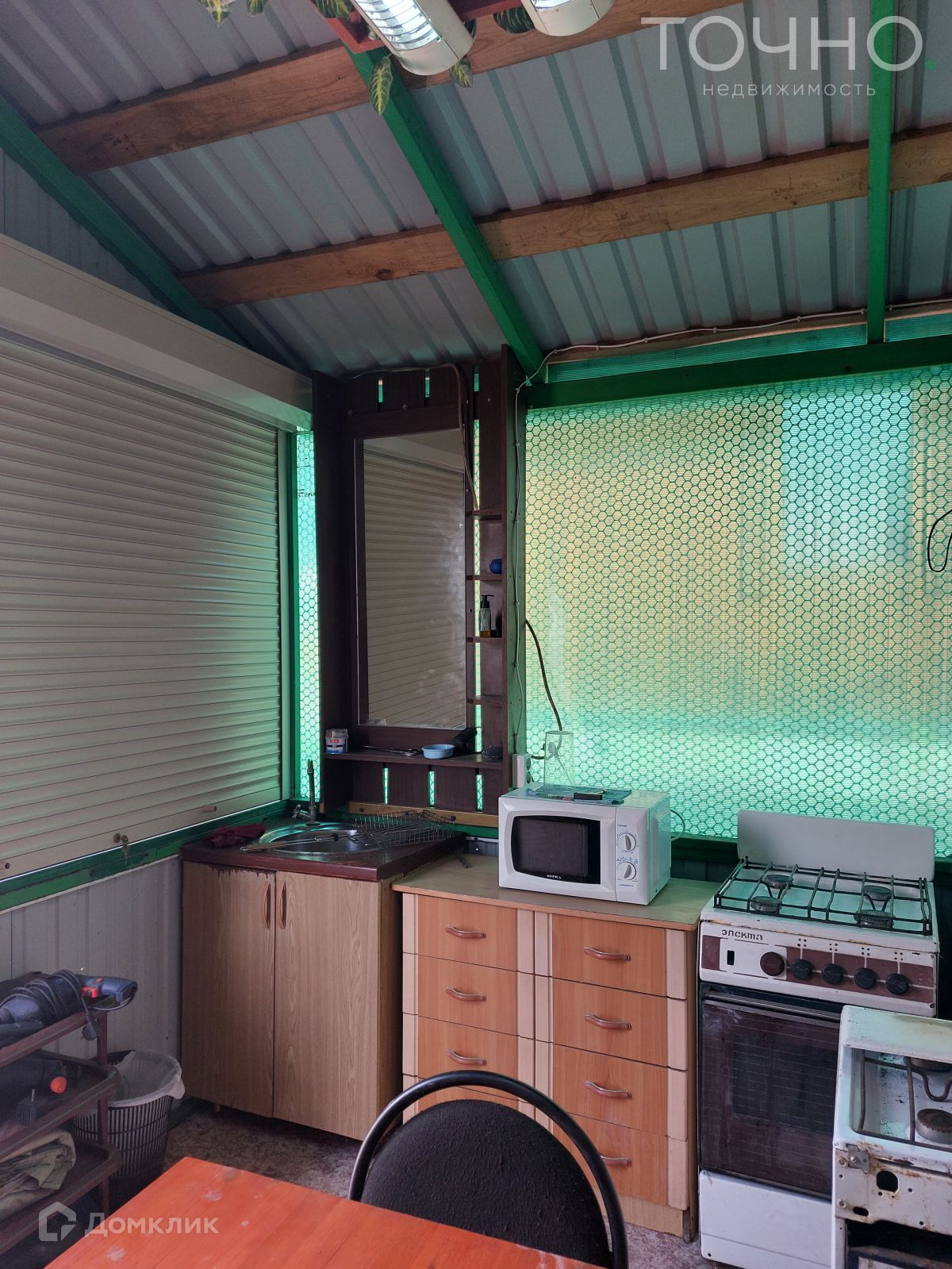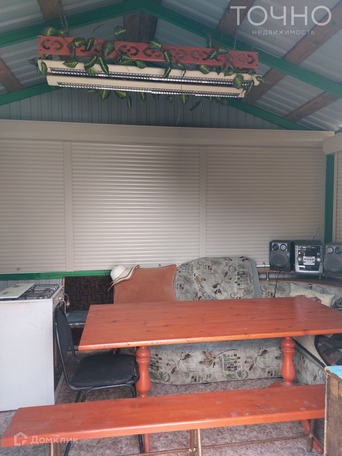 Летняя кухня, 15 кв.м, оснащена закрывающимися рольставнями, на кухне большой стол, холодильник, телевизор, рабочая зона с раковиной.