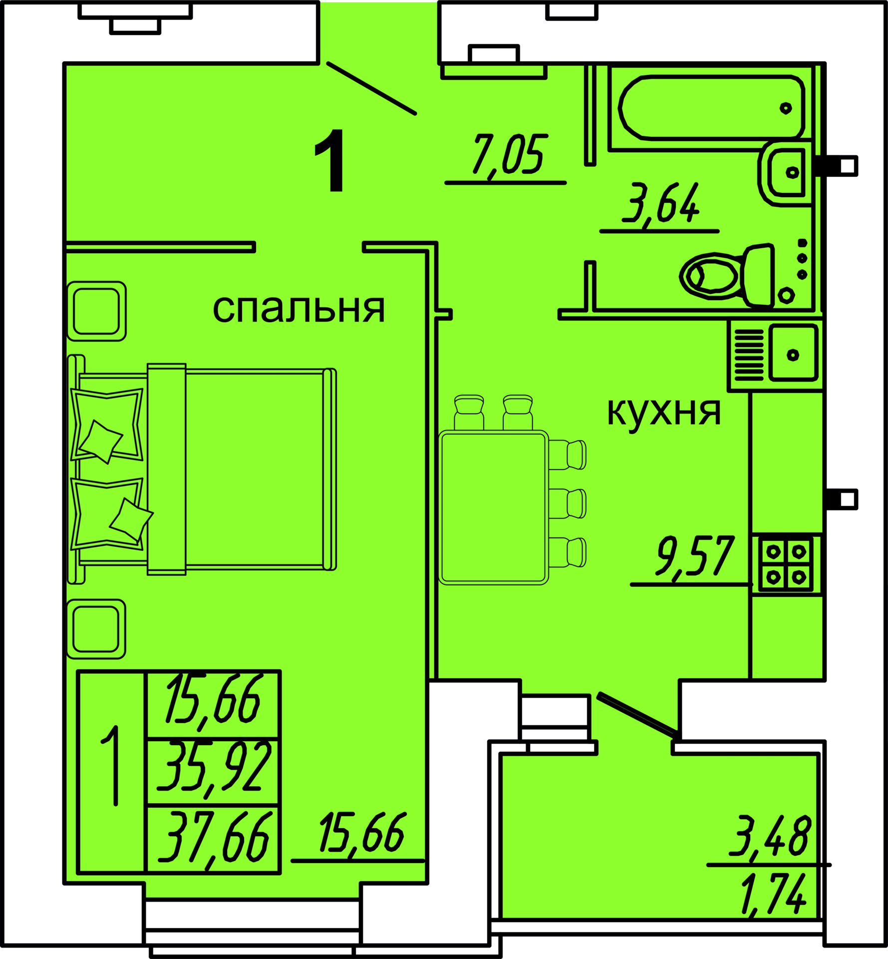 Общая площадь – 37,66 кв.м, жилая - 15,66 кв. м, кухня – 9,57 кв.м.
