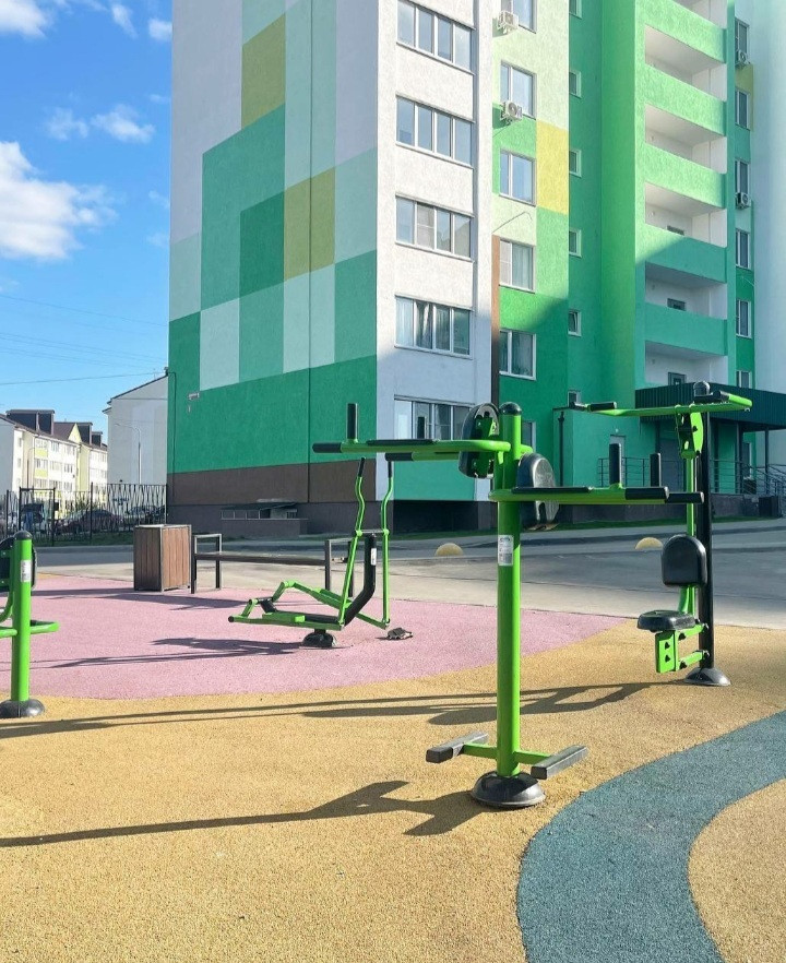 Благоустроенный двор, с безопасным резиновым покрытием на детской и спортивной площадке.