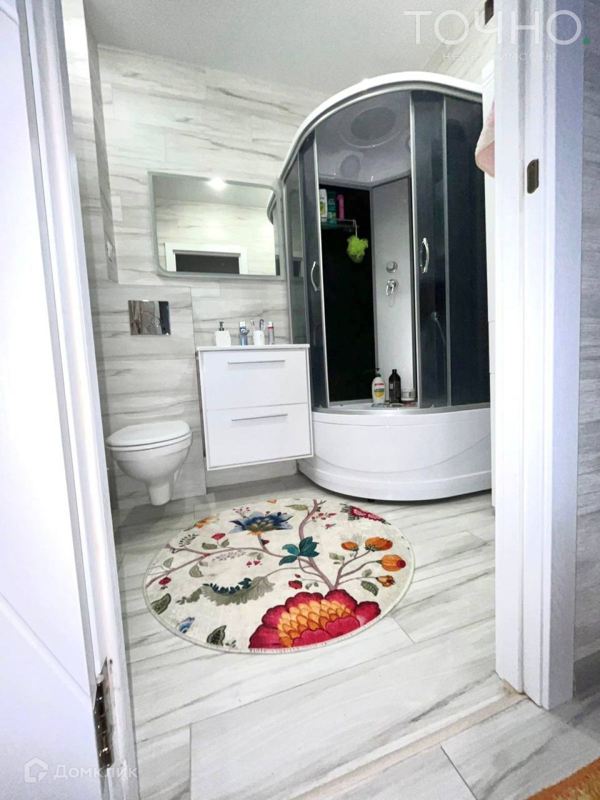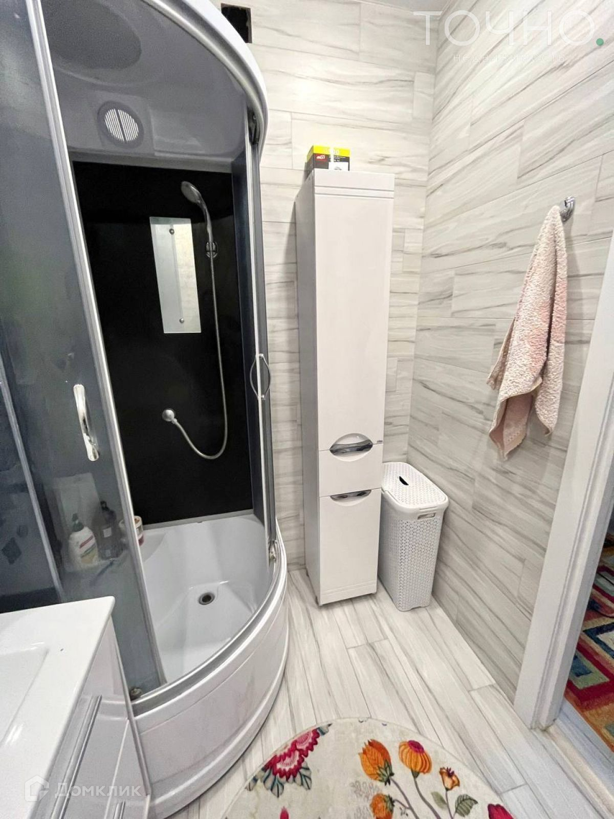 Санузел в кафеле, установлена душевая кабина и инсталяция.