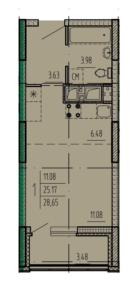 Общая площадь 28,65 кв.м. . Жилая площадь 11,08 кв.м.. Кухня 6,48 кв.м.. Лоджия 3,48 кв.м..С/у совмещенный.  Имеется выбор этажей и планировок .