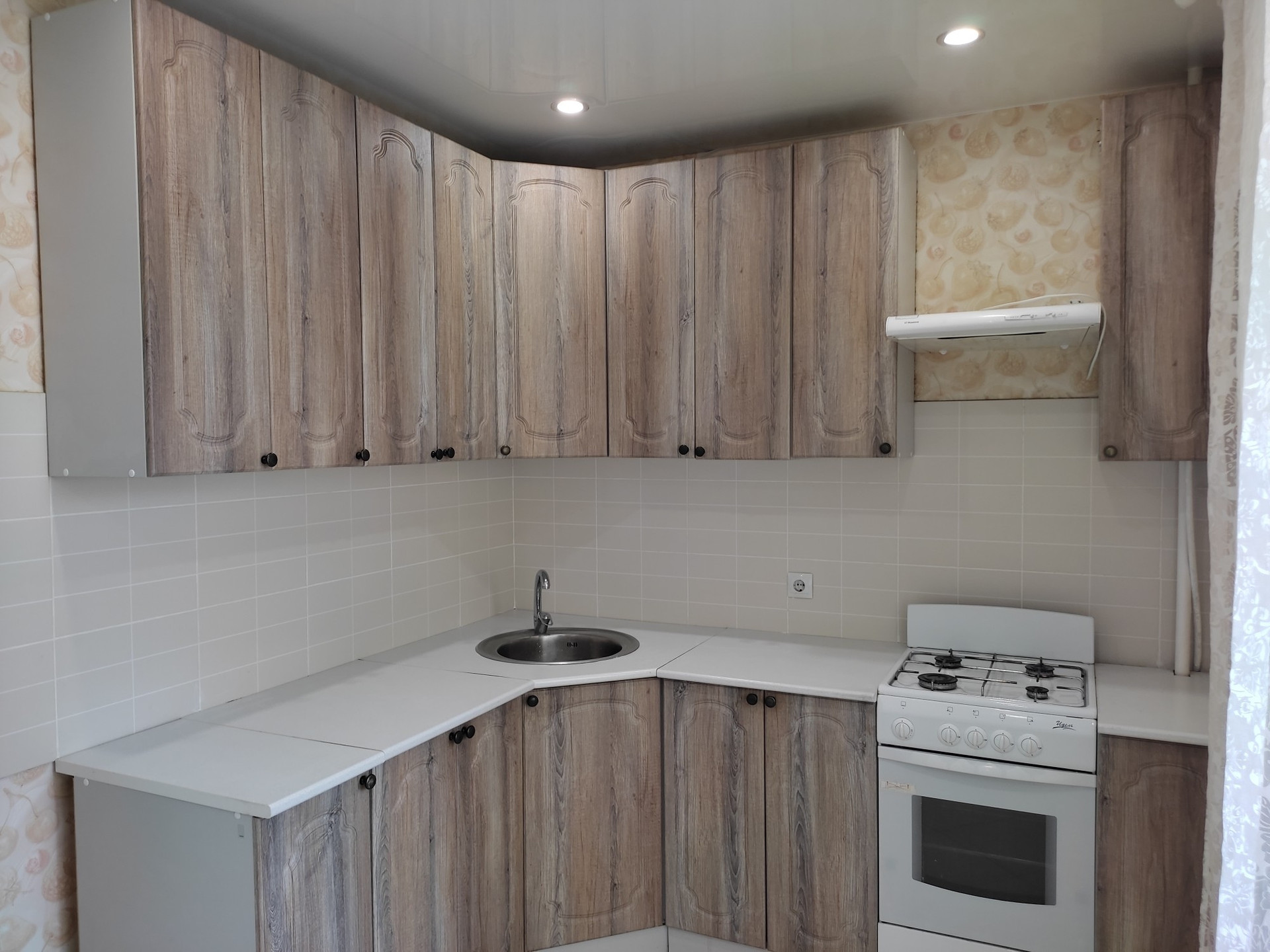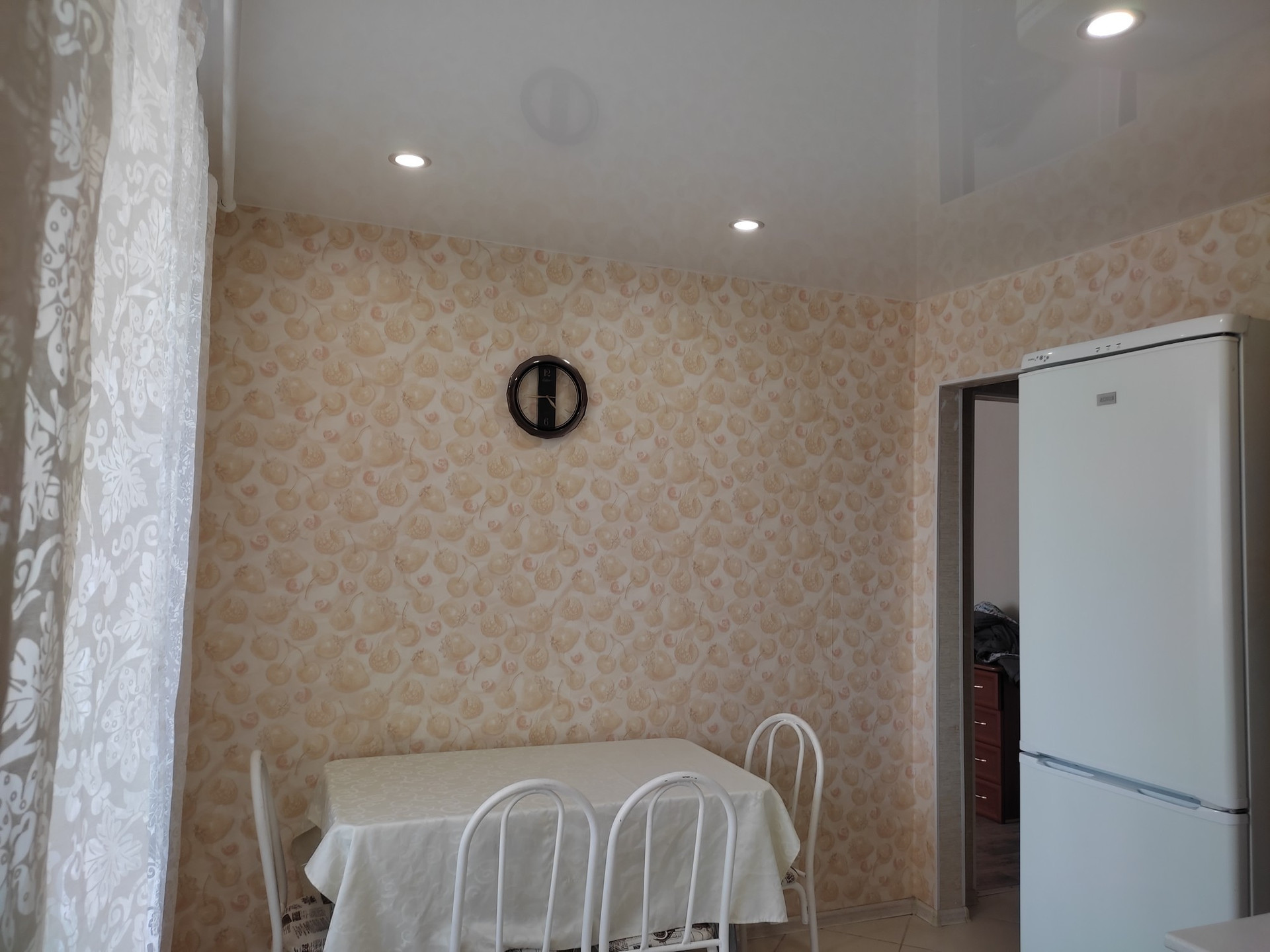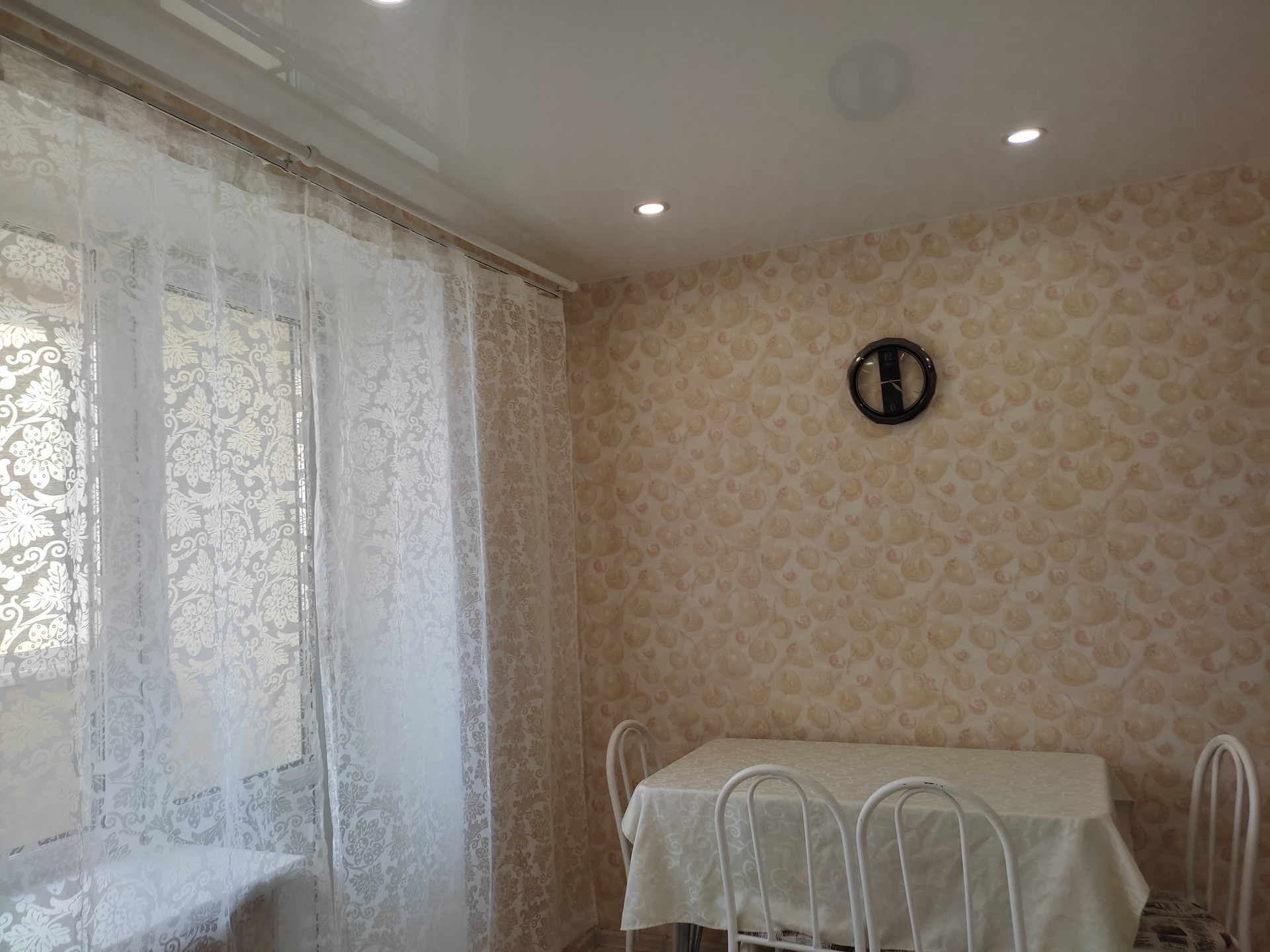 Останется: кухонный гарнитур, стол со стульями, шкаф, тюли, картины.