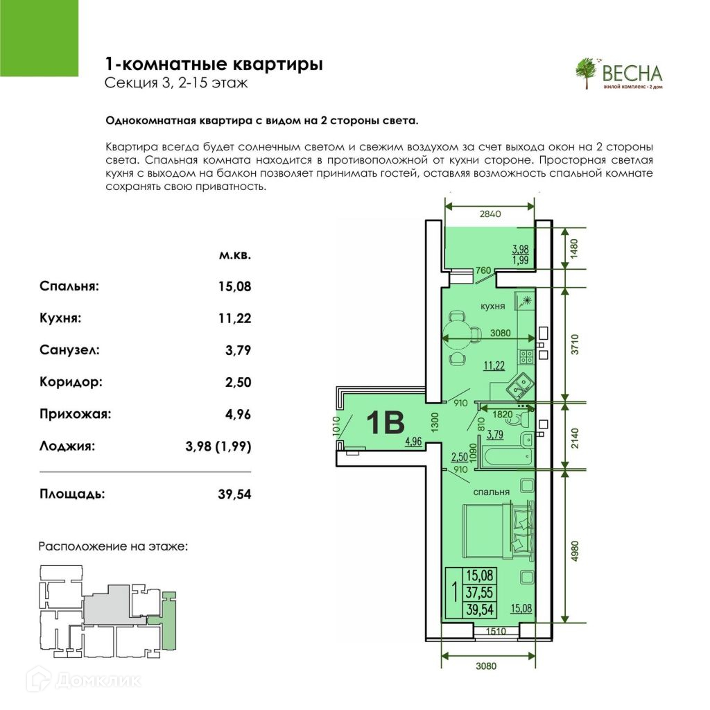 Жилая площадь -15,1 кв. м, кухня -11,2 кв.м.Высота потолков - 2.7 мВажные отличительные особенности этой квартиры: ощущение пространства и удачная планировка (распашонка), в которой сочетается большая кухня и полноценная комната, с интересными видами.Из окон открывается вид на две стороны.