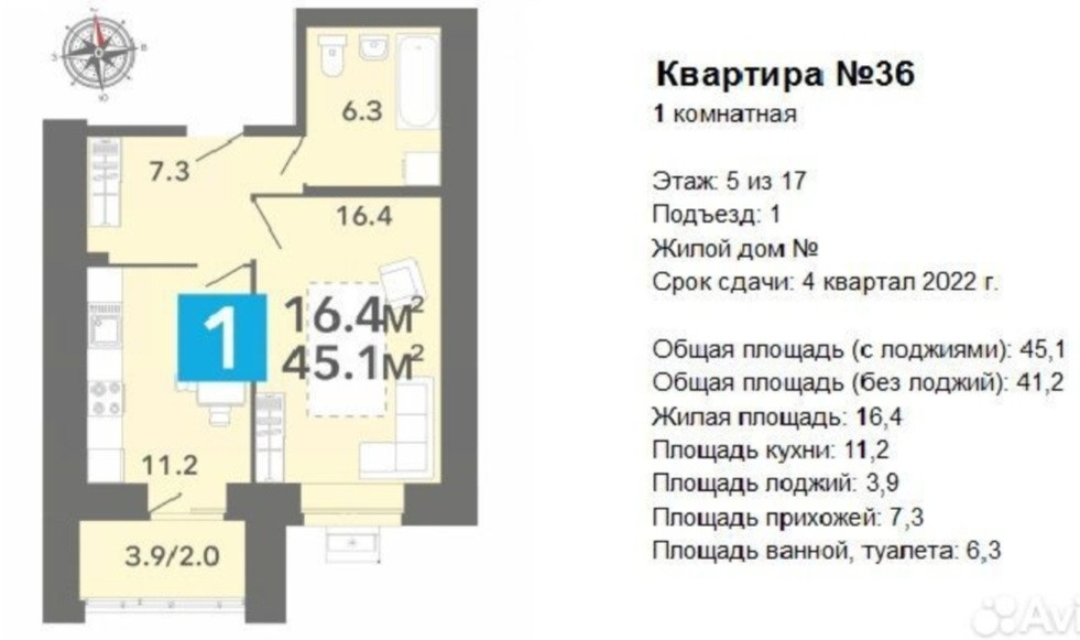 - Общая площадь (без лоджий): 41.2 кв.м