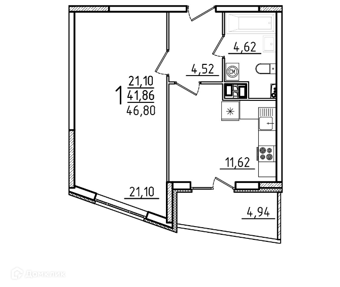 Квартира с черновой отделкой. Общая площадь 46,80 м,  комната жилая 21,10 м, кухня-гостиная 11,61 м, просторная лоджия с красивым видом на город.
