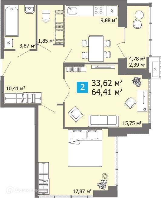 Общая площадь  64,41 м2 . Жилая площадь  33,62 м2 . Кухня  9,88м2
