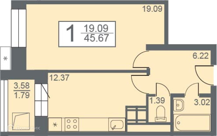 Общая площадь 45,67 м2 . Жилая площадь 19,09 м2 . Кухня 12,37 м2 ..