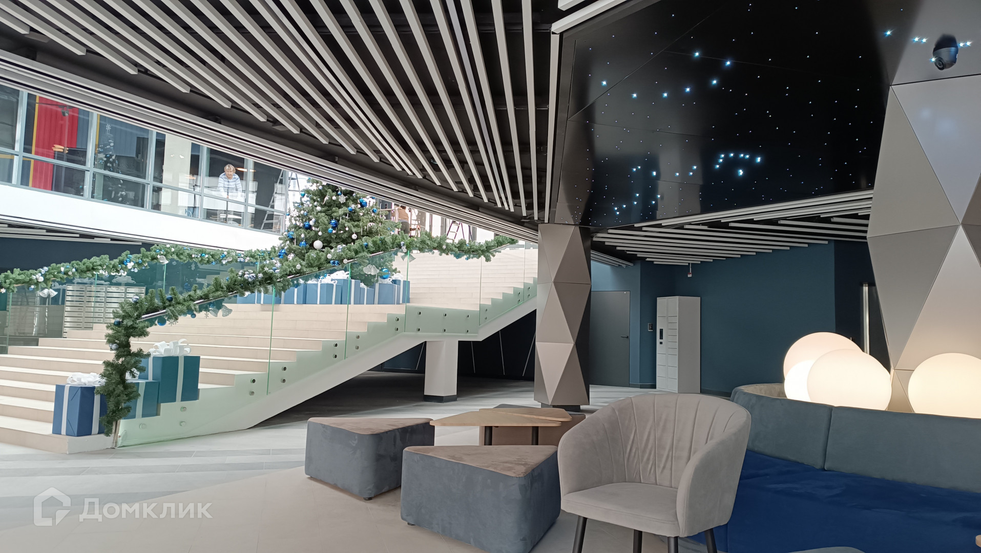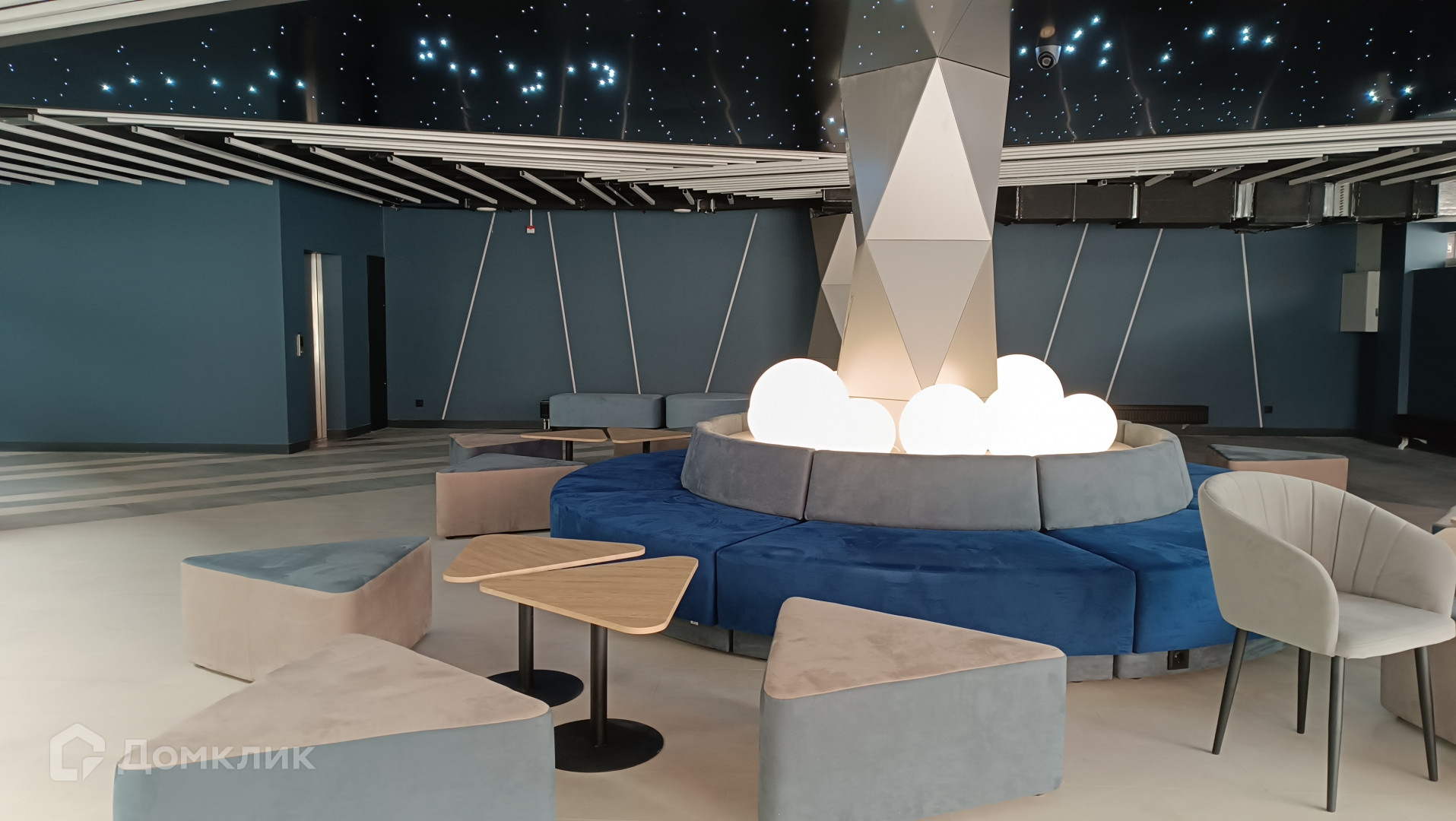 Закрытый двор без машин, на уровне второго этажа  с дизайнерской подсветкой и арт объектами