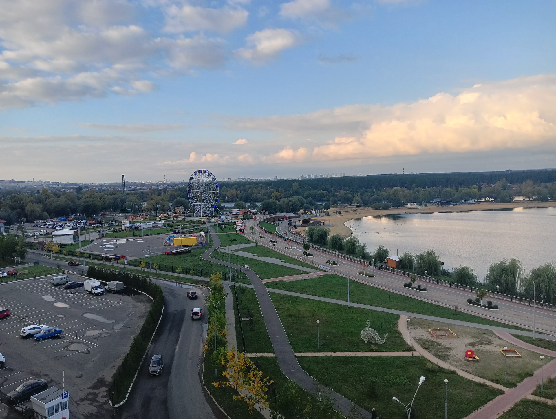 Огороженная территория жилого комплекса с закрытой парковкой, благоустроенная территория с местами отдыха для взрослых и обустроенной детской площадкой, фонтан во дворе. Шикарный вид из окон на пляж, набережную и лес.