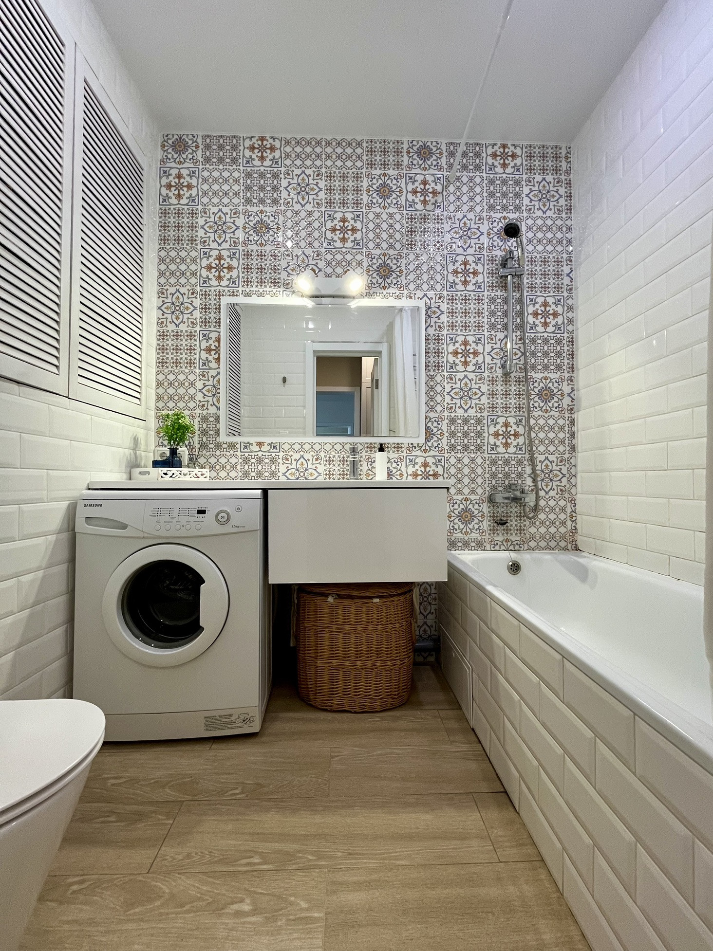 Совмещенный сан. узел в качественной плитке, установлен подвесной унитаз, сделана удобная зона хранения для бытовых принадлежностей, где так же установлен водонагреватель на 80 литров. Раковина реализована в виде монолитной столешницы, под которую удобно становится стиральная машинка.
