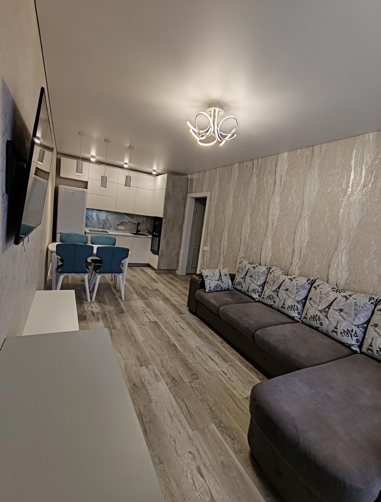 В кухне встроена посудомоечная машина, духовой шкаф, микроволновая печь, варочная панель, вытяжка (на всю технику ещё действует гарантия 3 года), холодильник будет Haier высотой под кухню. В квартире остаётся все, что представлено на фото, кроме 2-х телевизоров.