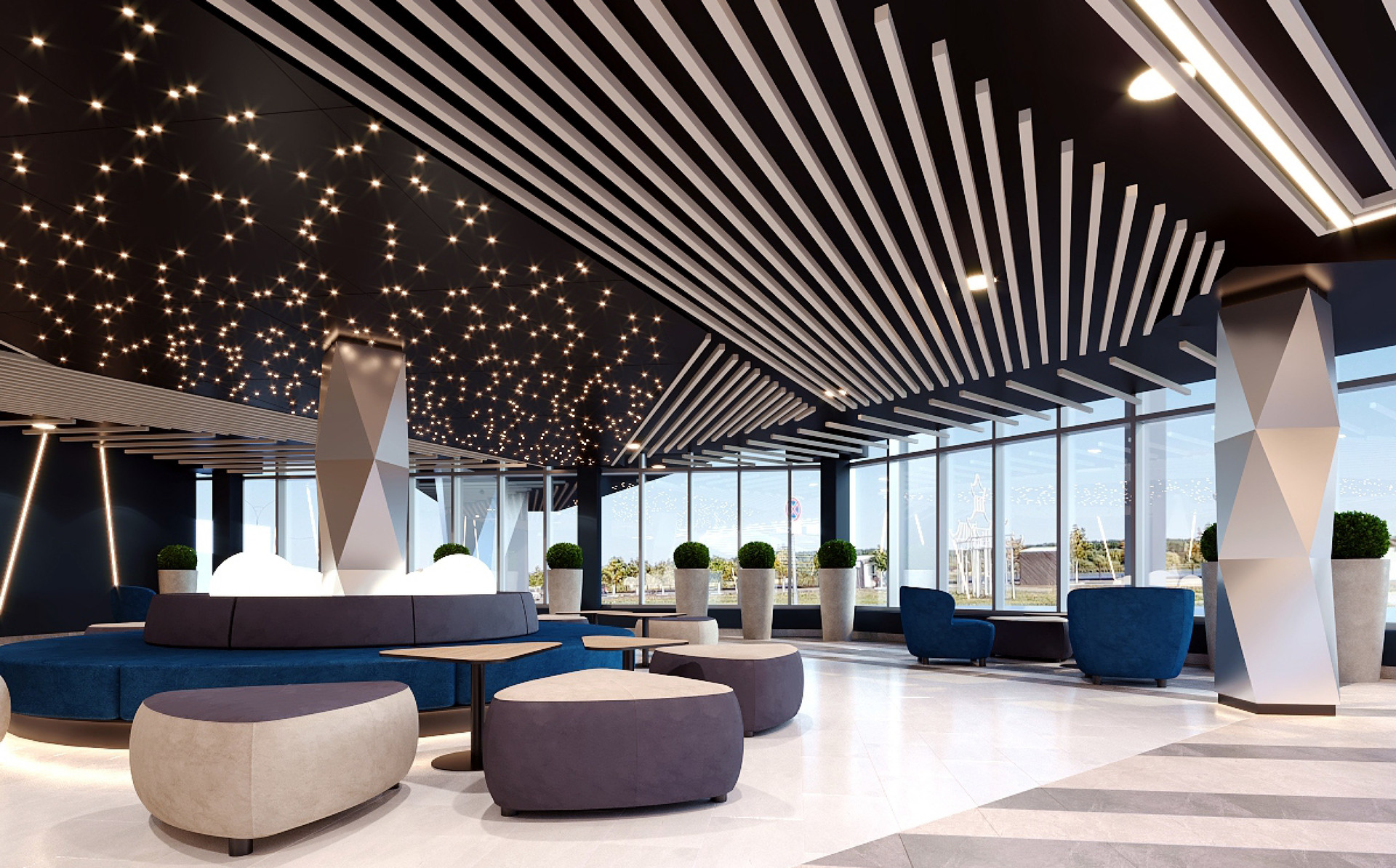 В холлах, согласно авторскому проекту, воссоздана атмосфера звездного неба и бескрайнего космоса. Для комфорта жильцов  в холлах обустроена мягкая зона, лапомойки и колясочные,  вход в подъезды без ступеней.