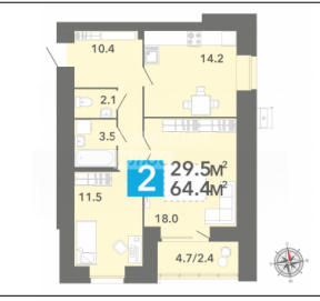 Общая площадь 64.4 м2