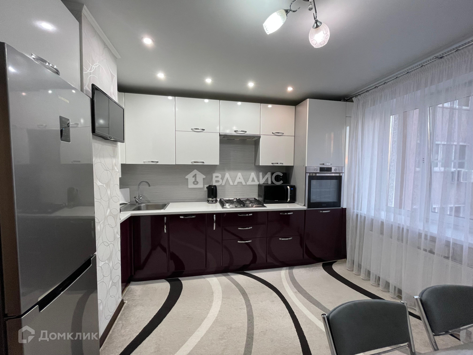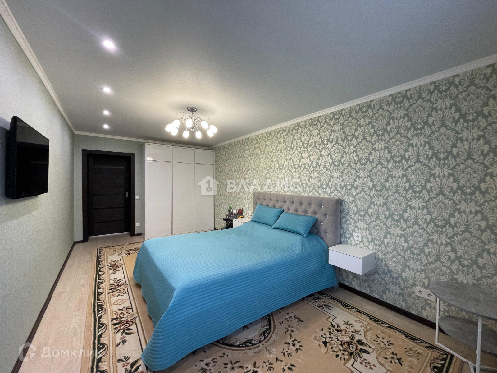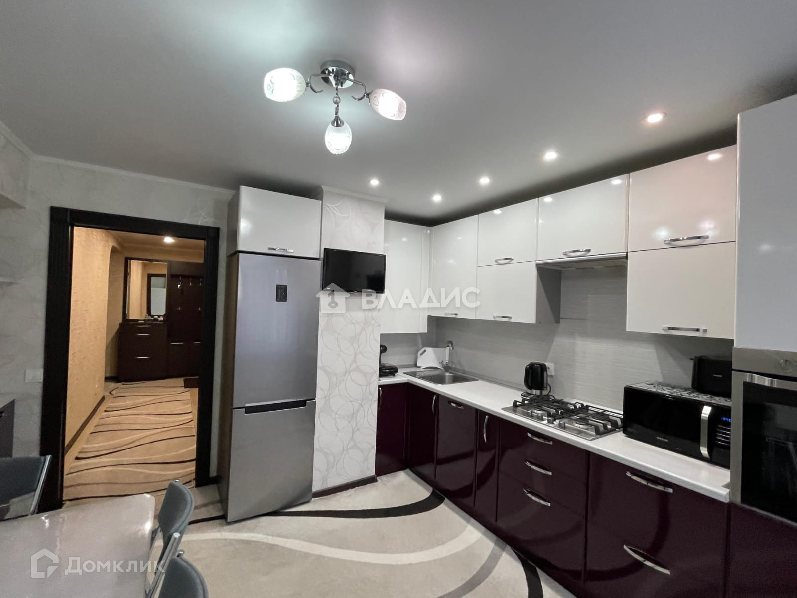 Потолки натяжные, с точечным итальянским освещением и светодиодными люстрами с различными режимами освещения.