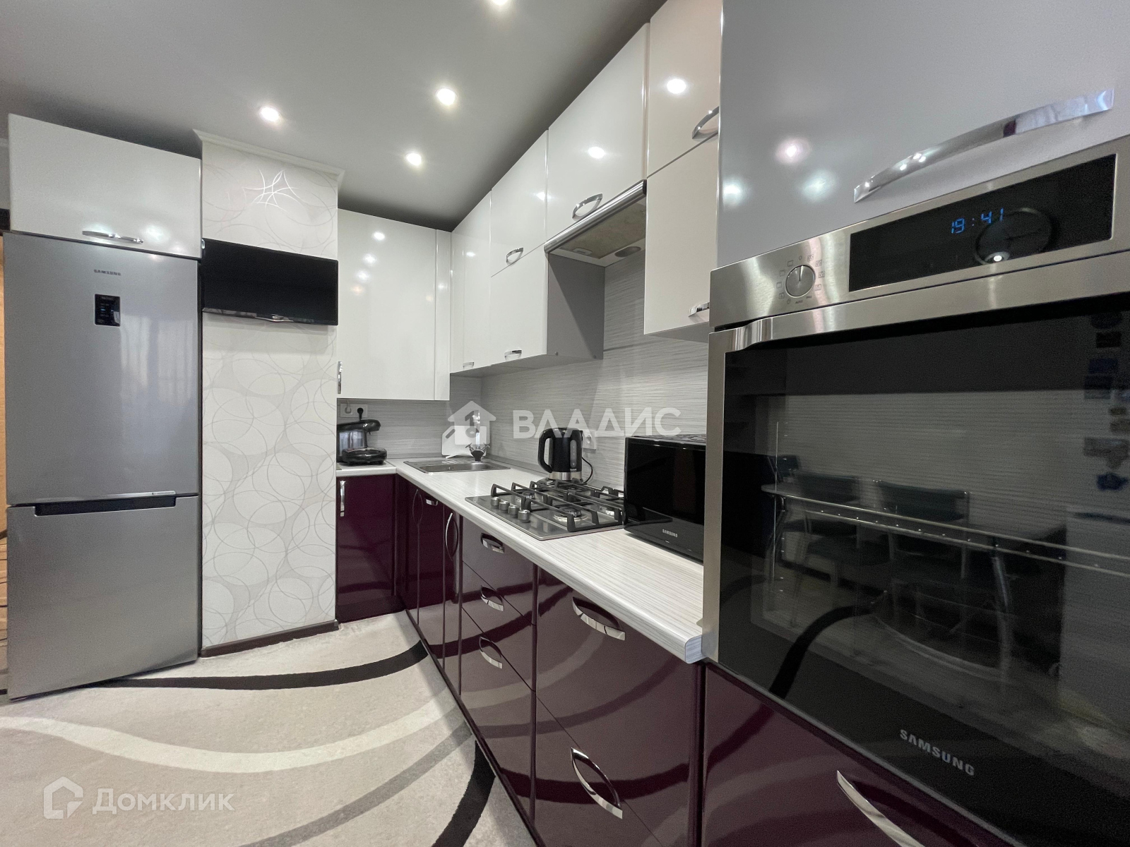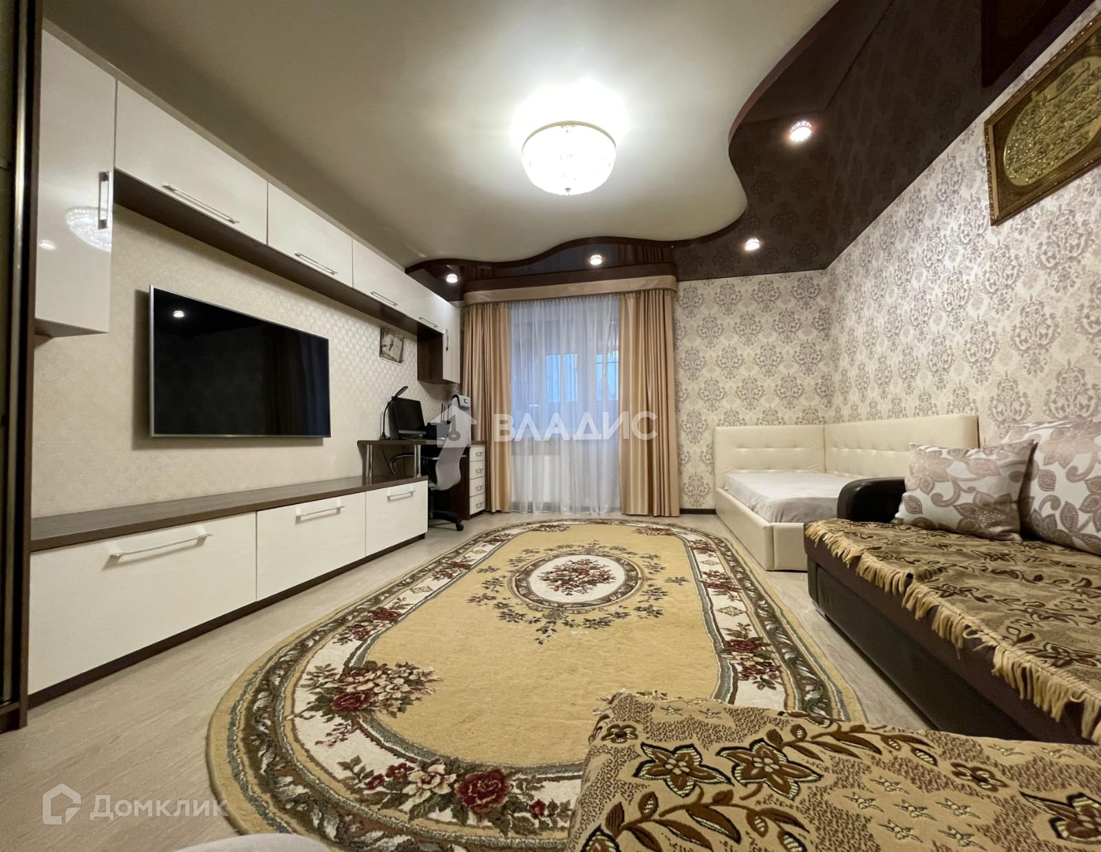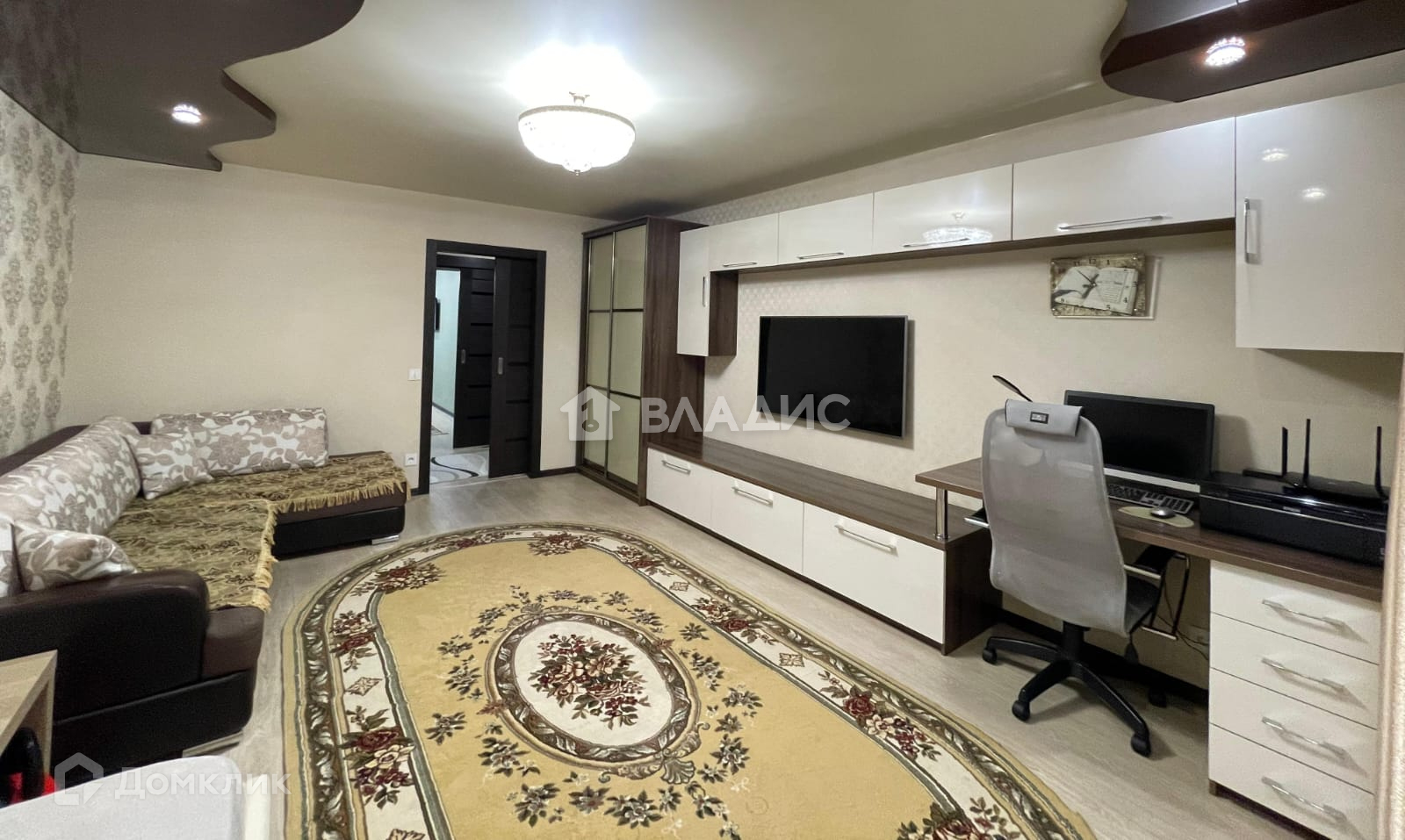 Потолки натяжные, с точечным итальянским освещением и светодиодными люстрами с различными режимами освещения.