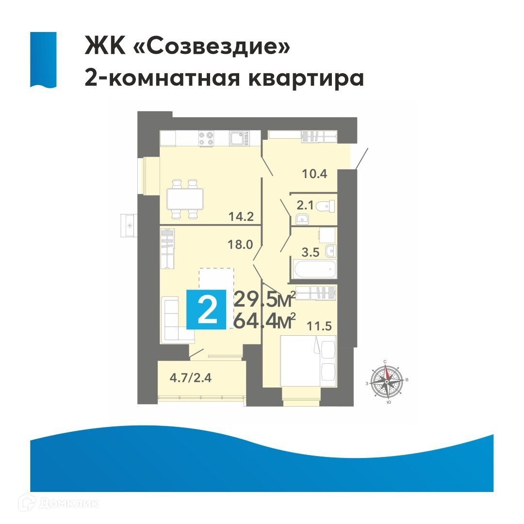 Общая площадь 64.4 м2