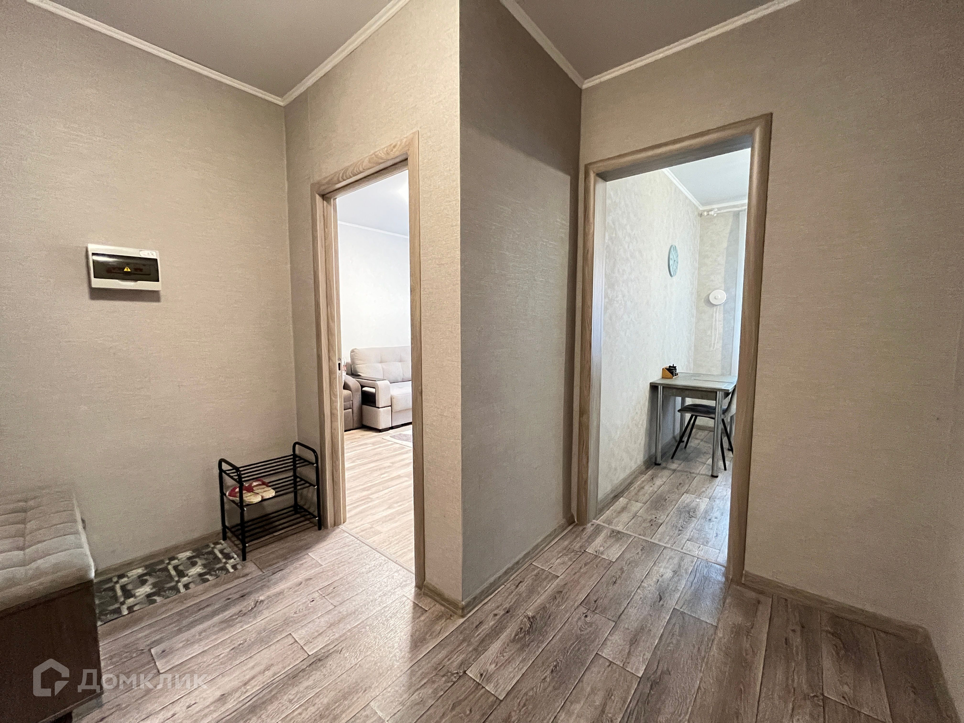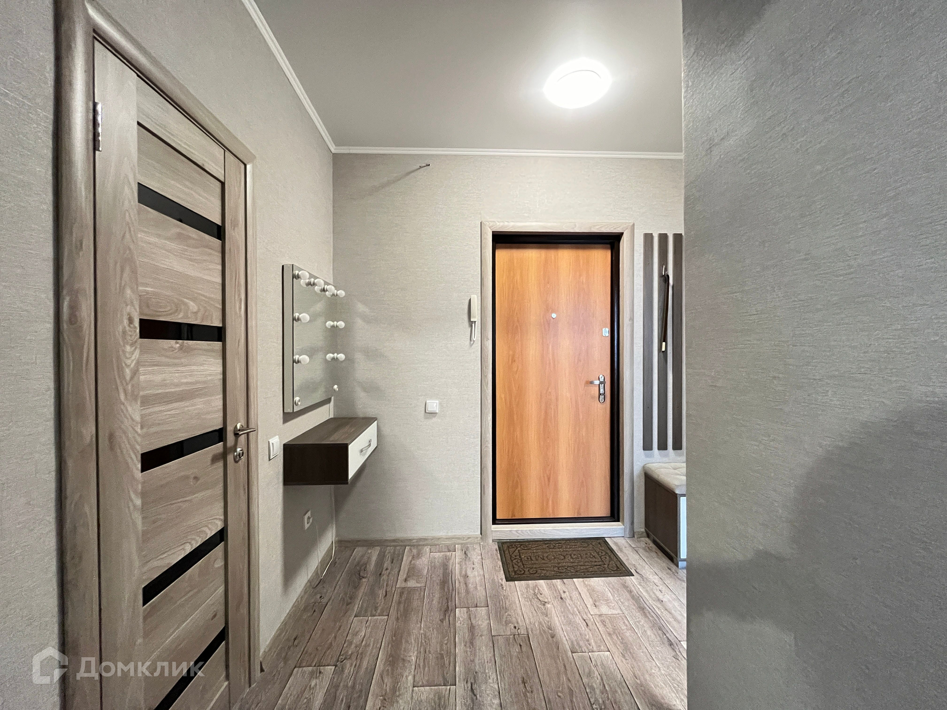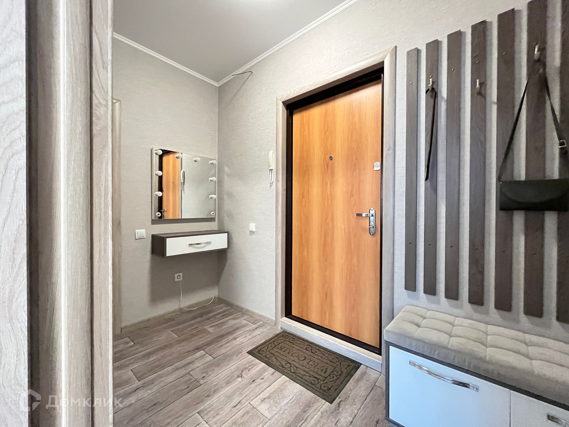ОСTАETСЯ МEБЕЛЬ: куxoнный гарнитур, вытяжка, плита, подвесная полка в комнате, вместительная гардеробная, кондиционер, полочка с зеркалом в коридоре, прихожая, пуфик.
