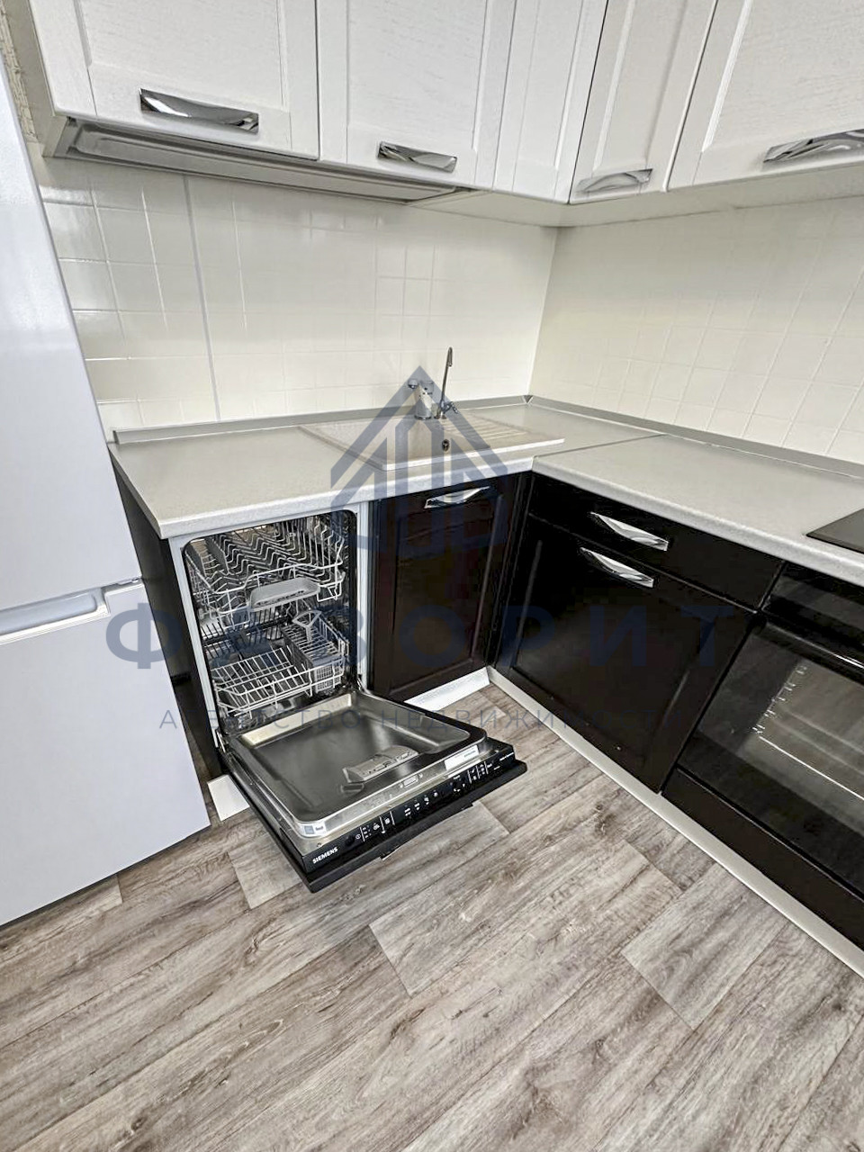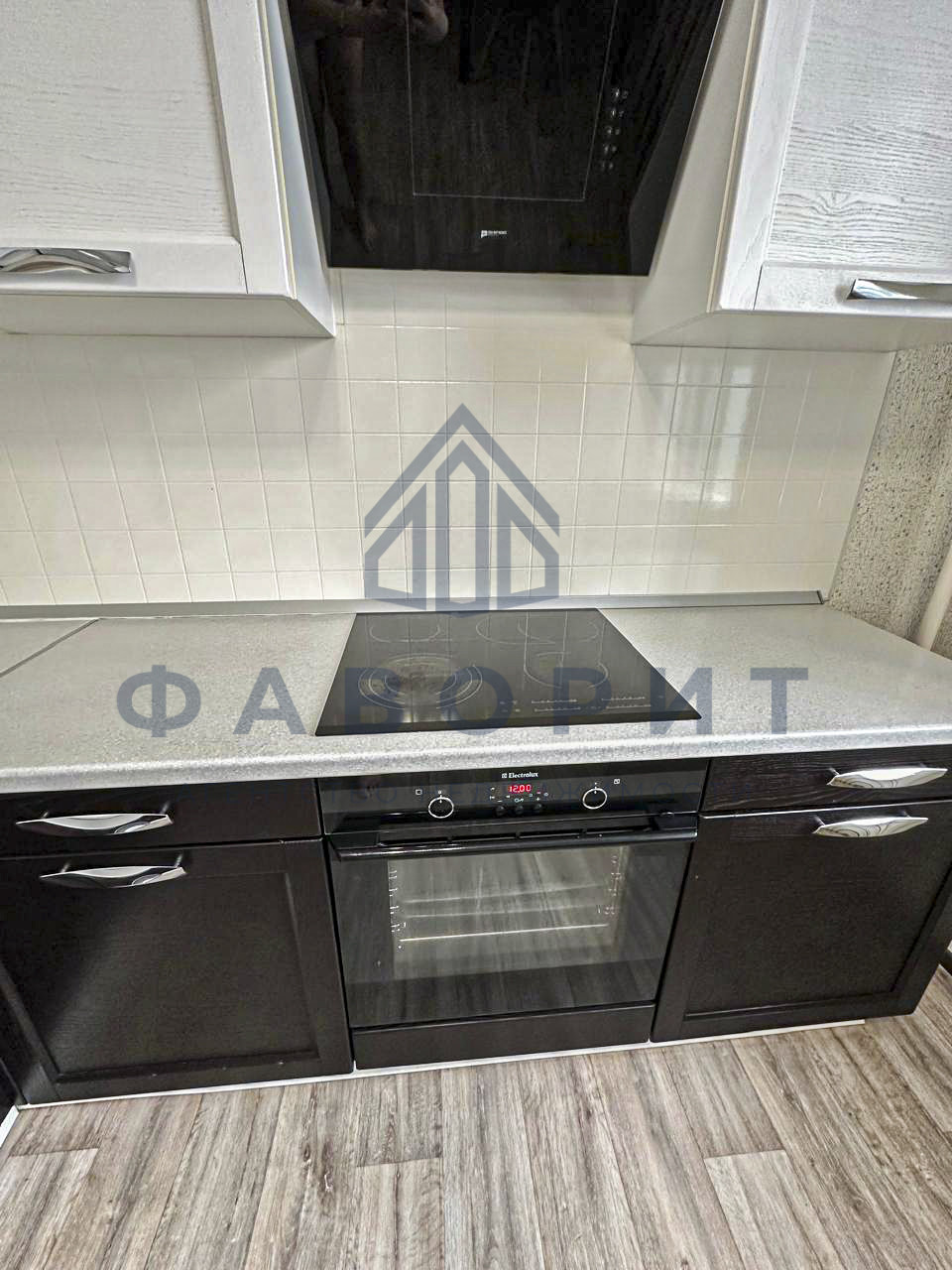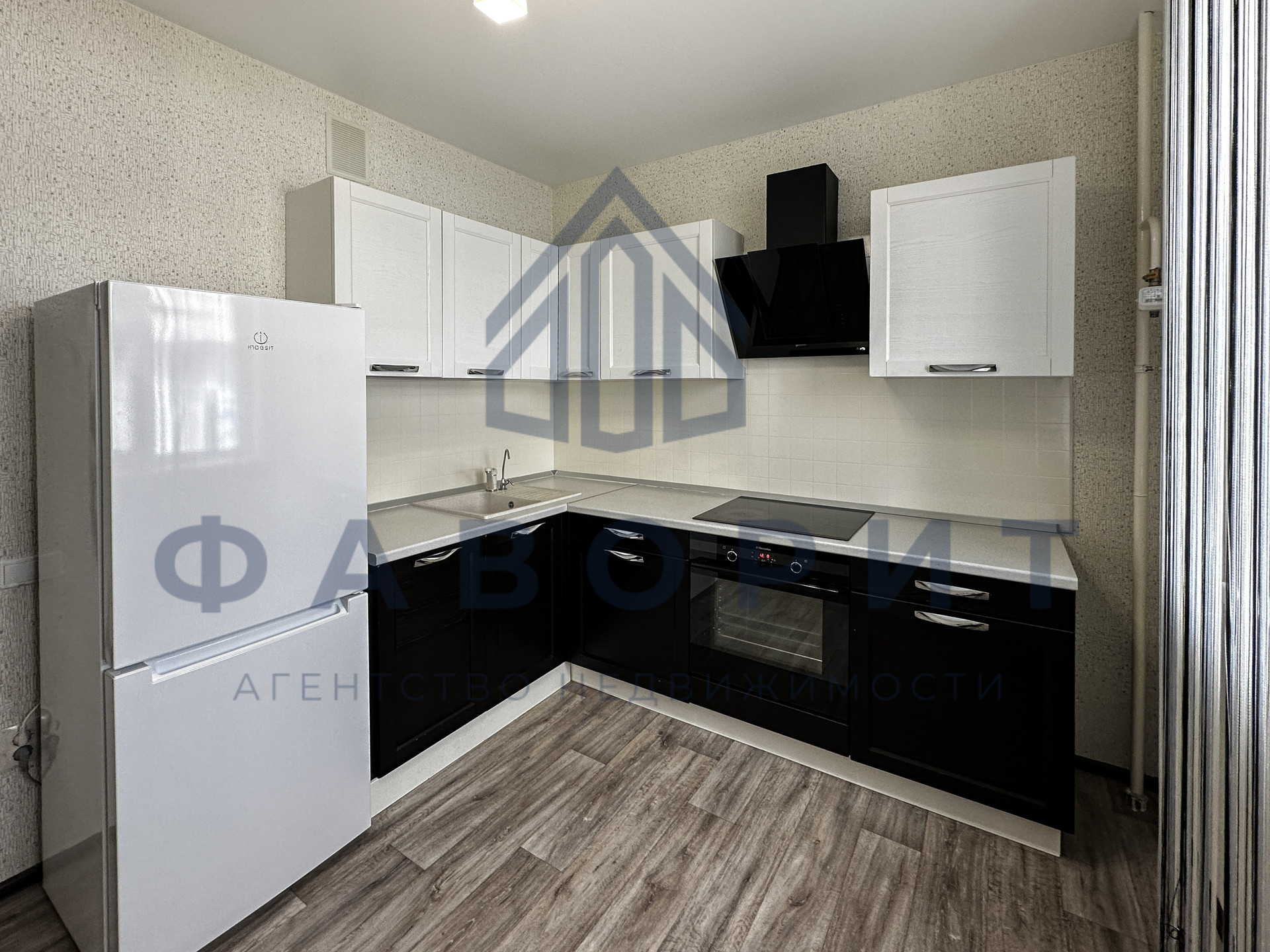 Просторная кухня с итальянским кухонным гарнитуром из ясеня. Раковина выполнена из камня. Новому владельцу останется: холодильник Indesit, варочная панель и духовой шкаф Electrolux, вытяжка, посудомоечная машина и стол со стульями.
