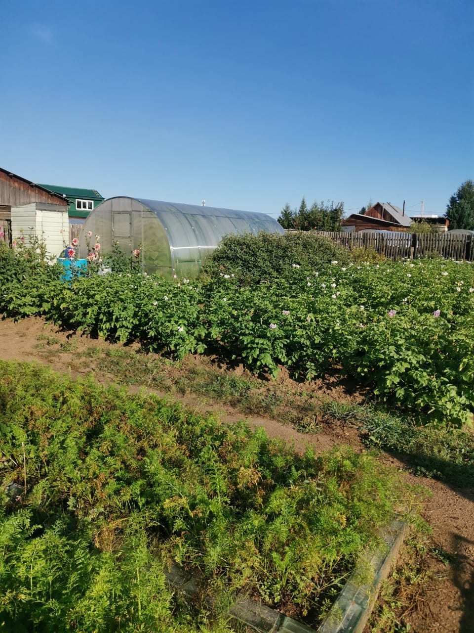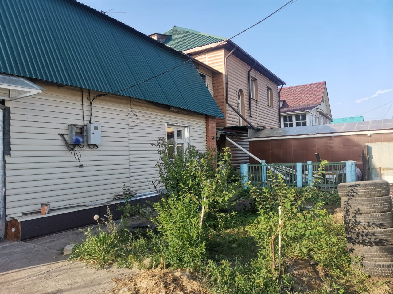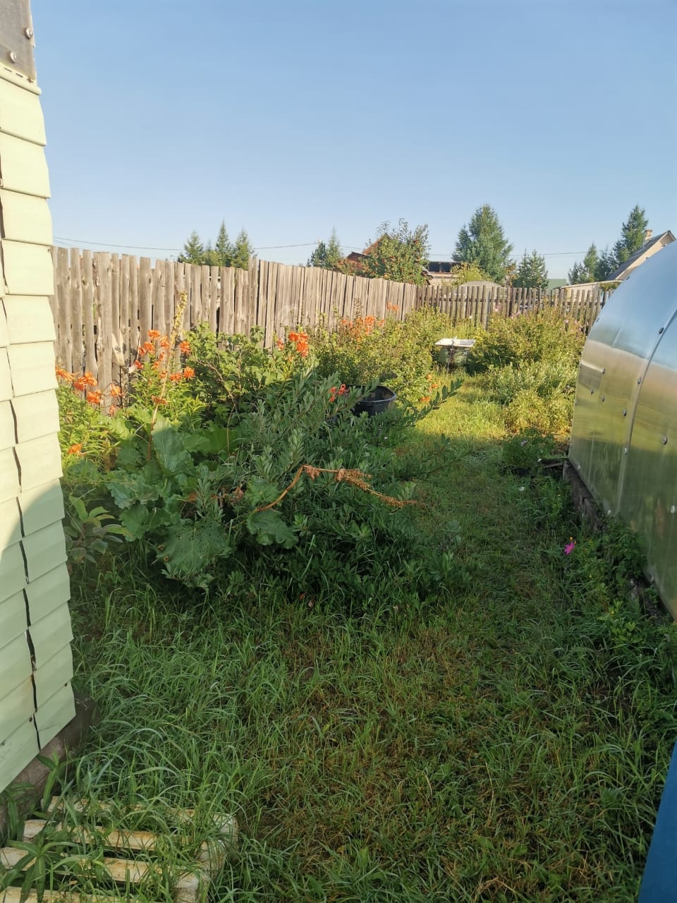 Весь участок огорожен забором из металлического профиля с внешней стороны + штакетник с внутренней стороны двора.