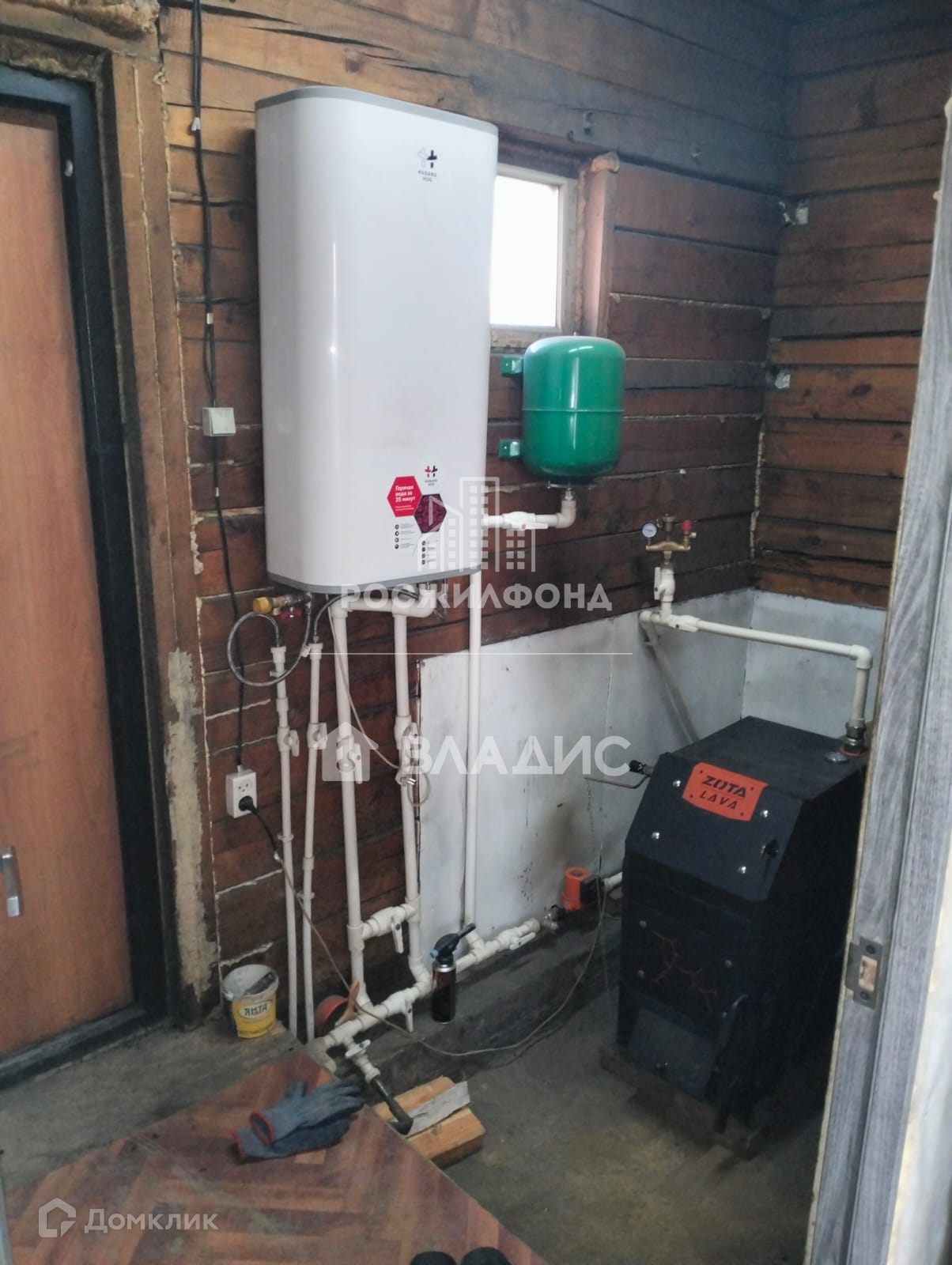 Отапливается твердотопливным котлом.