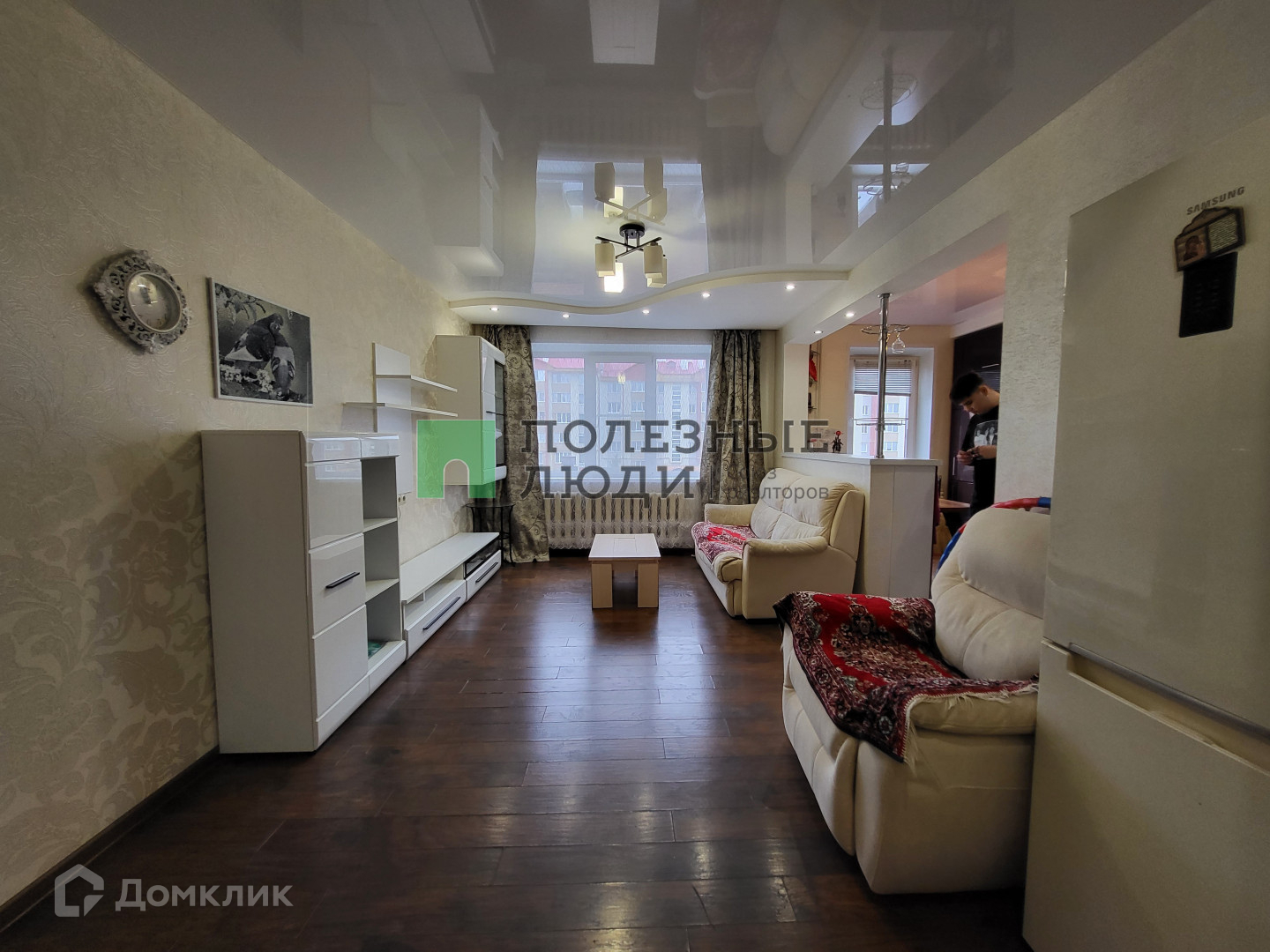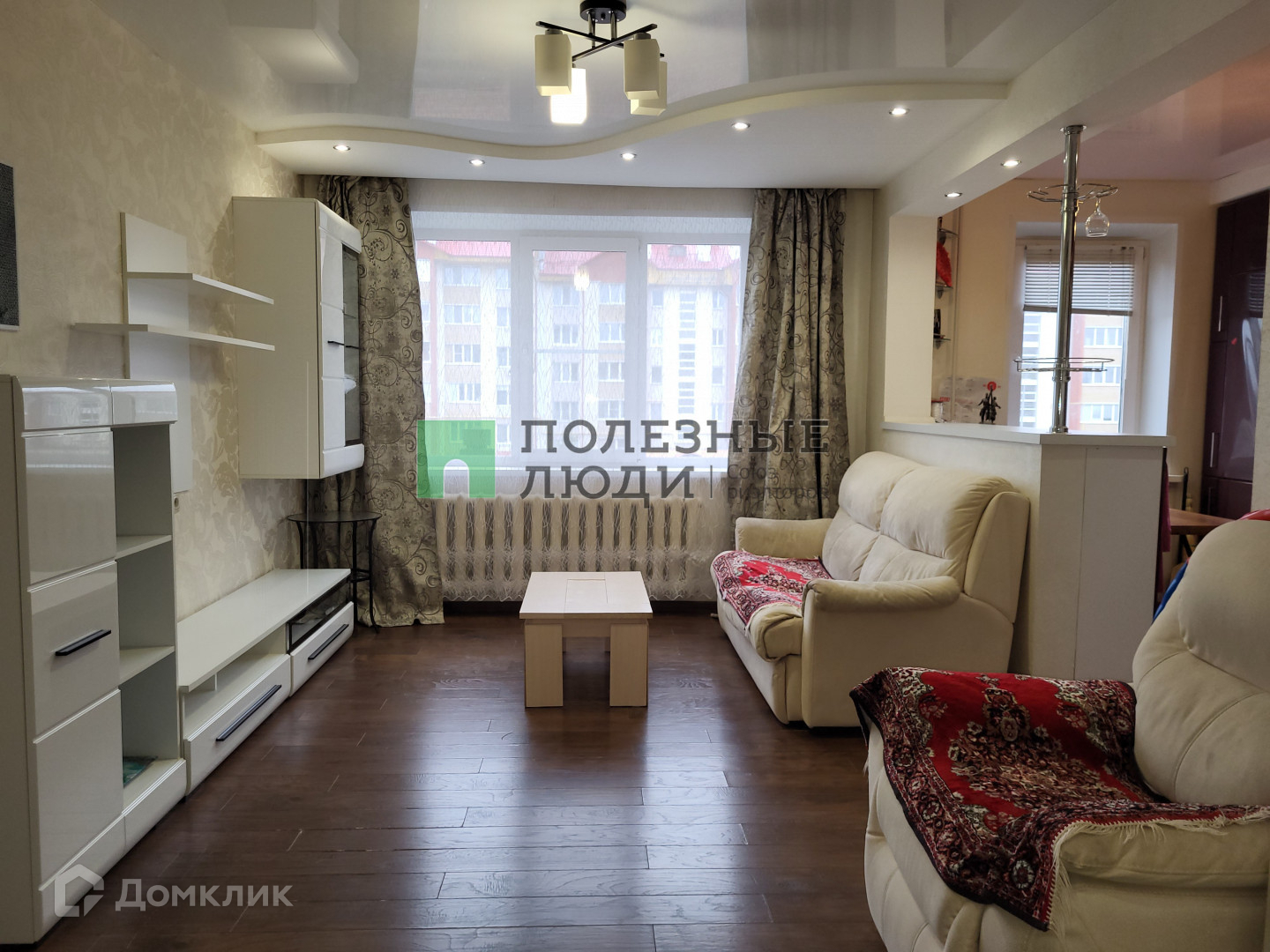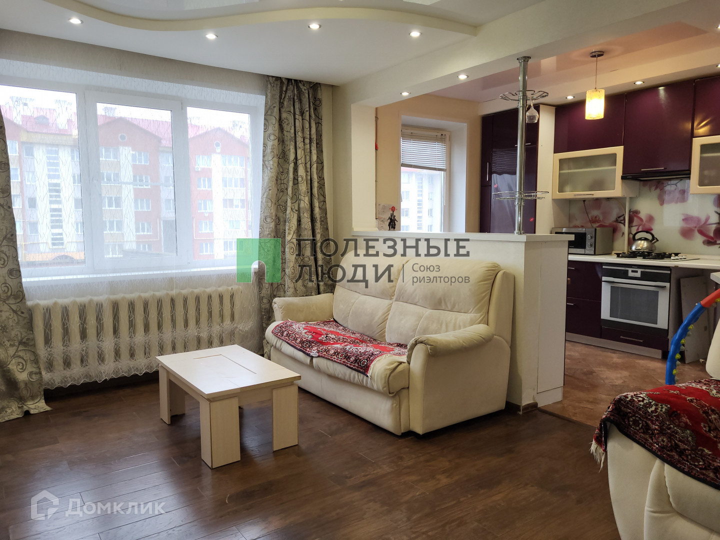 Удобная планировка: кухня соединена с гостиной (планировка узаконена), две изолированные комнаты, большая гардеробная, раздельный санузел.