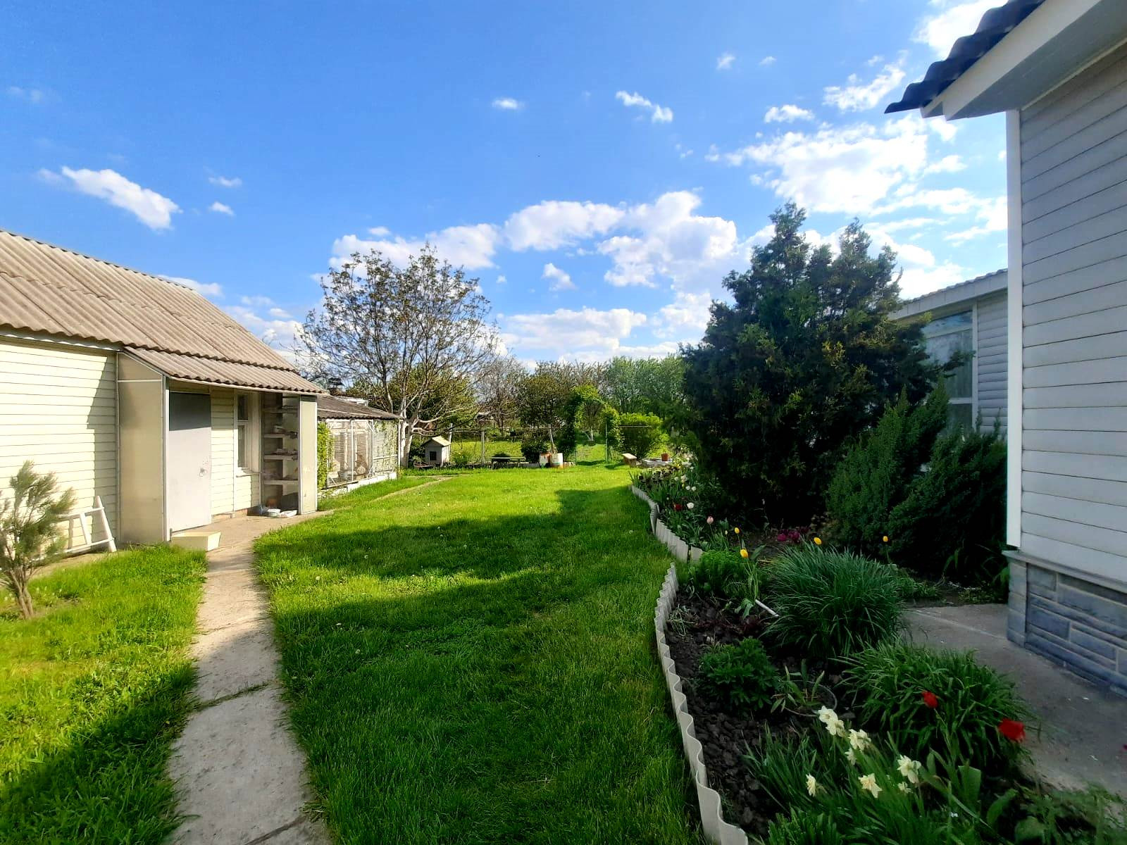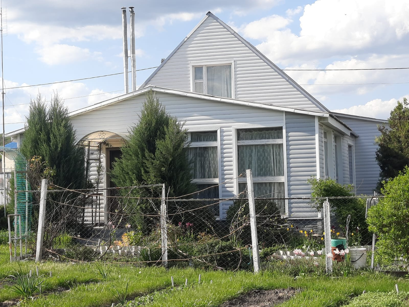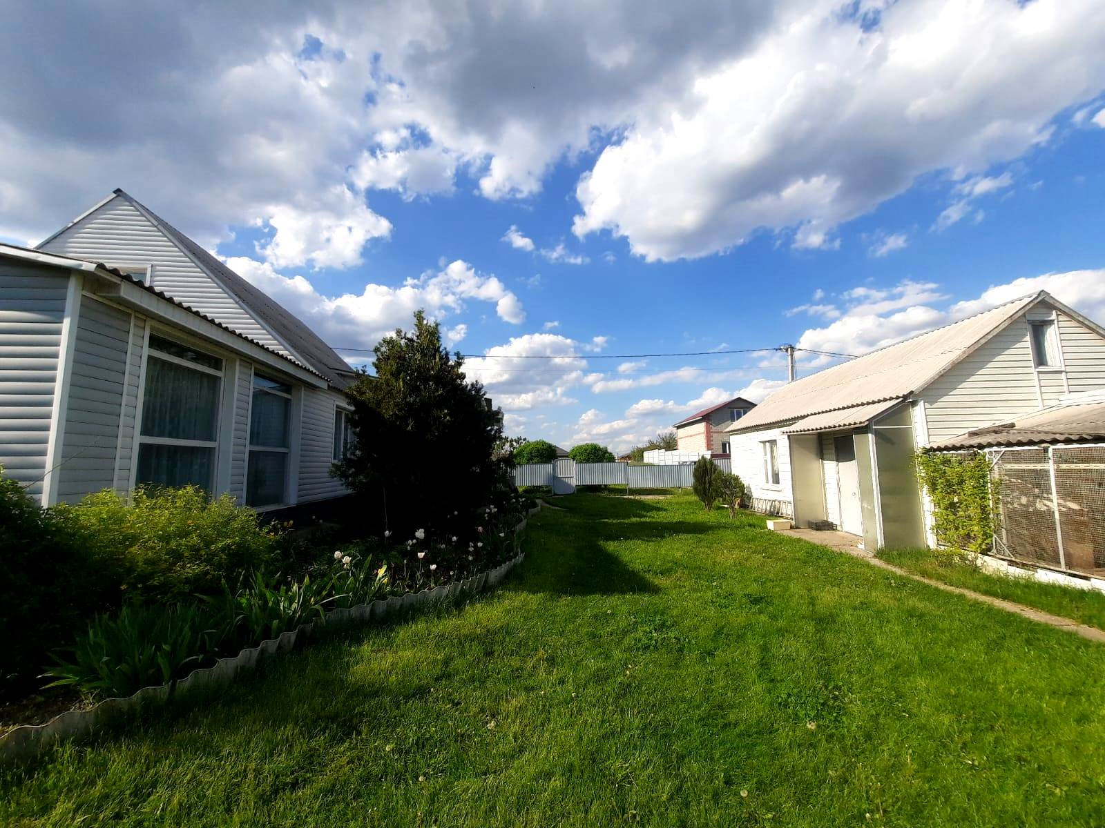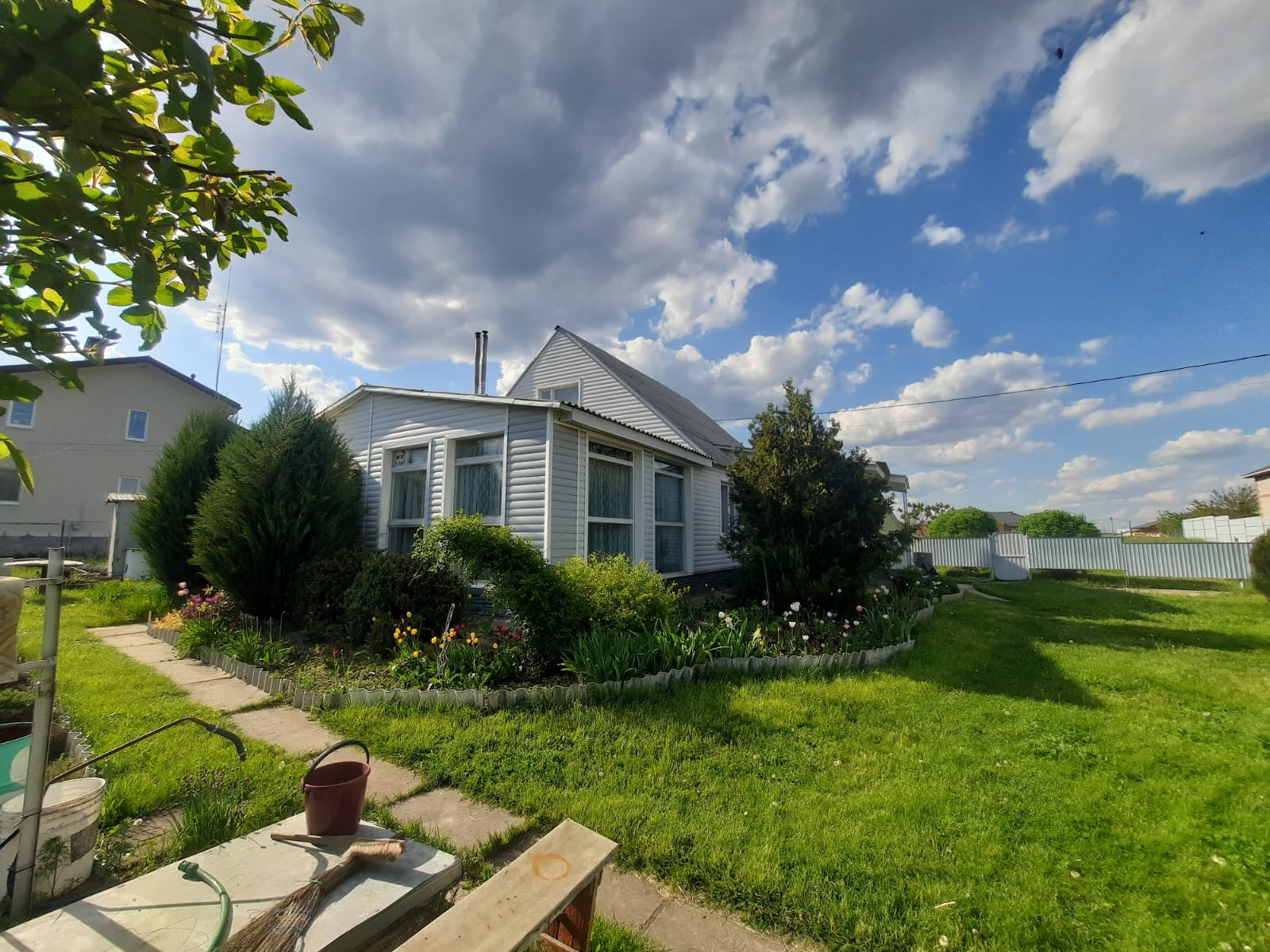 На участке также имеется гараж со смотровой ямой и подвалом, есть кладовка для инвентаря. Участок разработан, во дворе газонная трава, декоративные растения и цветы. Имеется забор с калиткой. Улица асфальтирована, соседи хорошие.