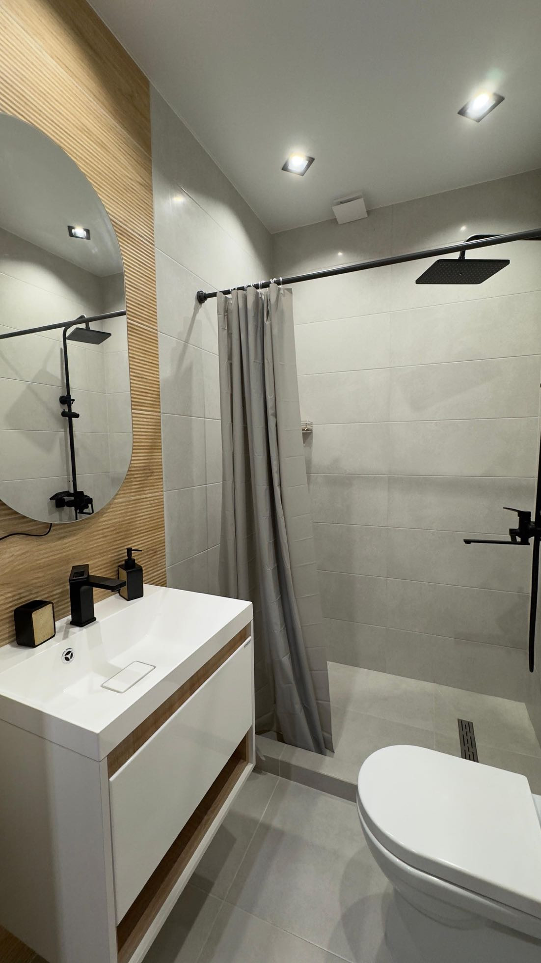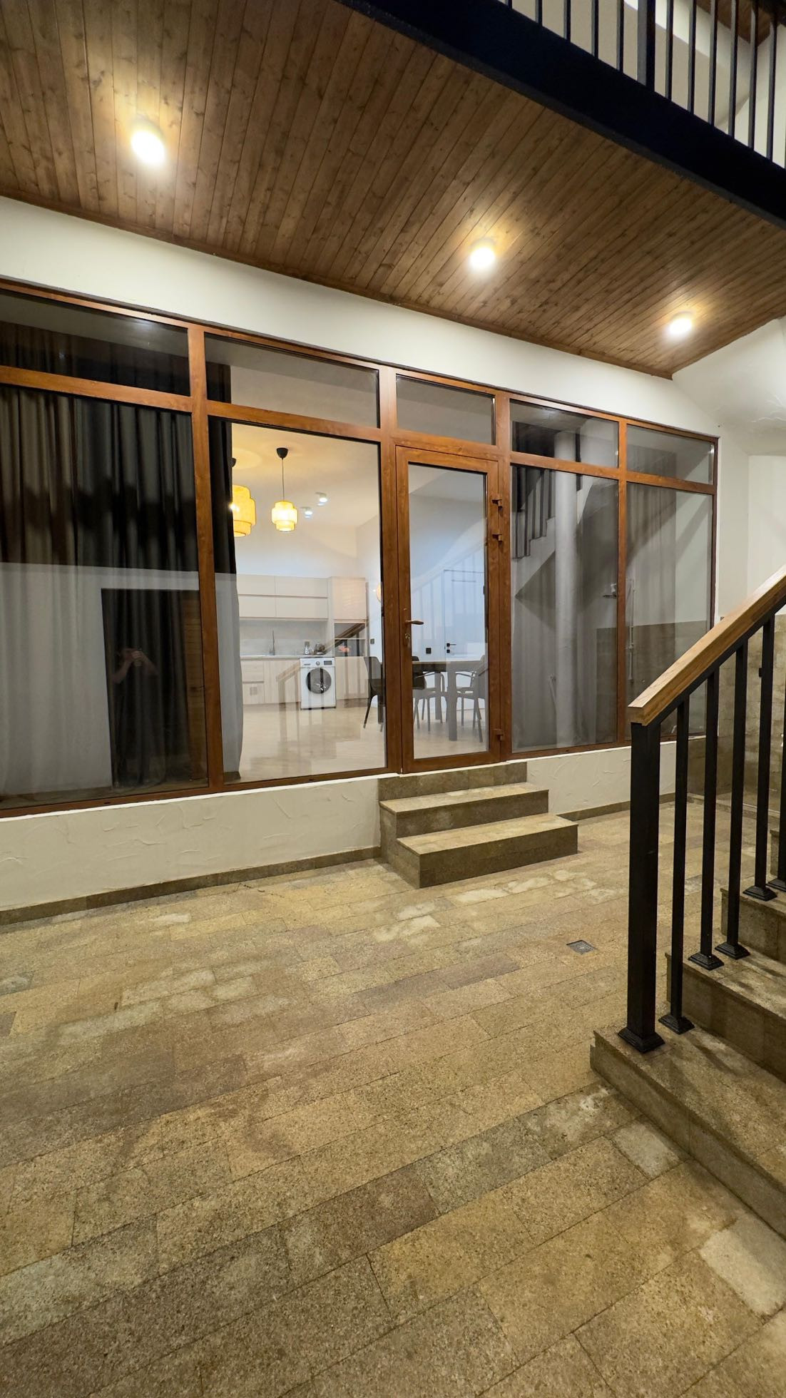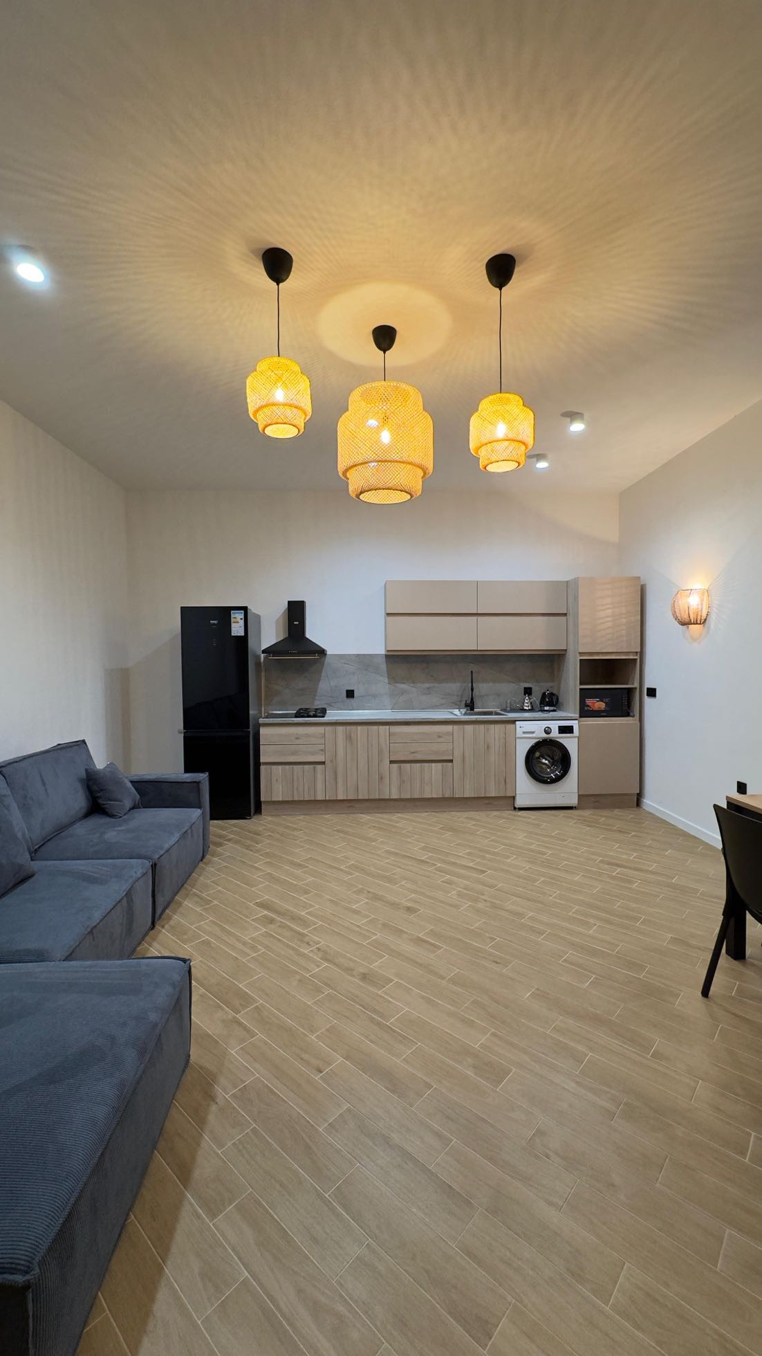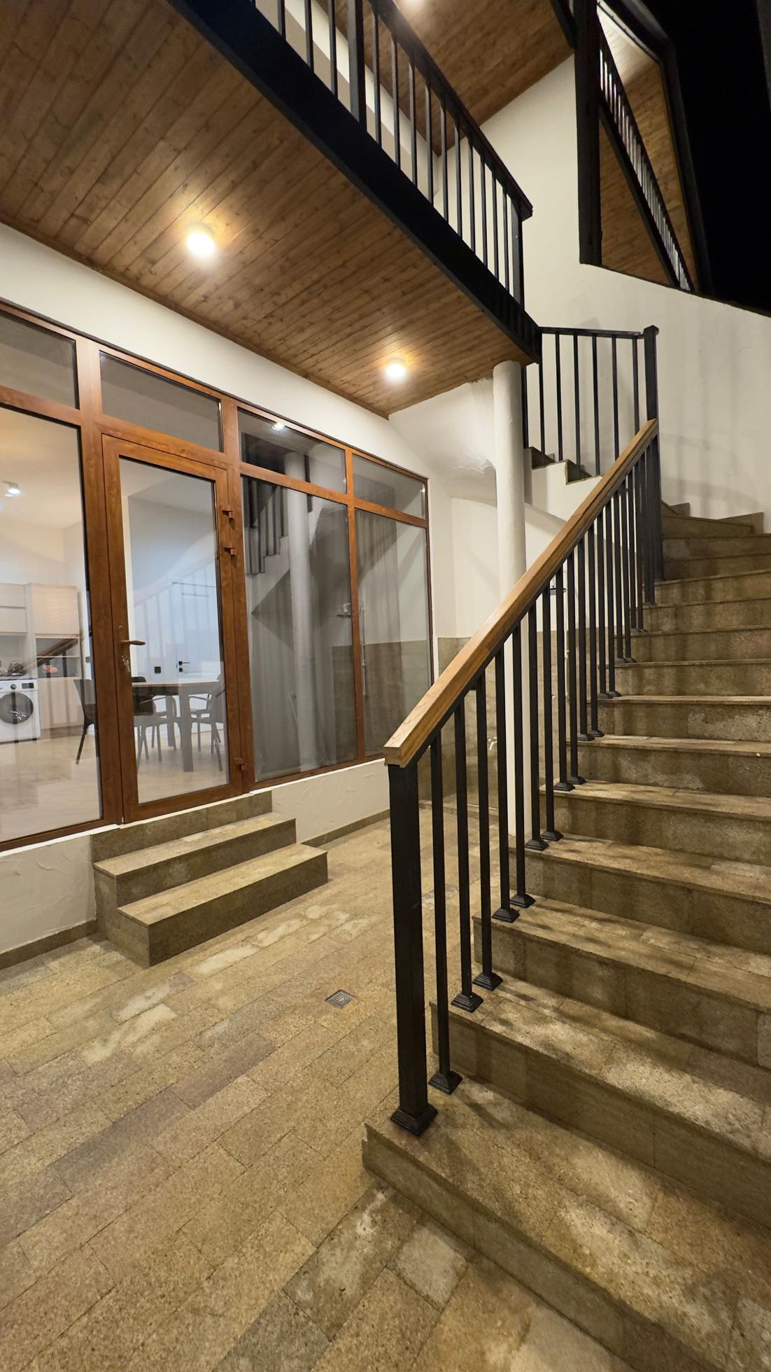 На первом этаже расположена большая кухня студия и санузел с душевой. Диван на первом этаже раскладывается и превращается в полноценную двуспальную кровать.