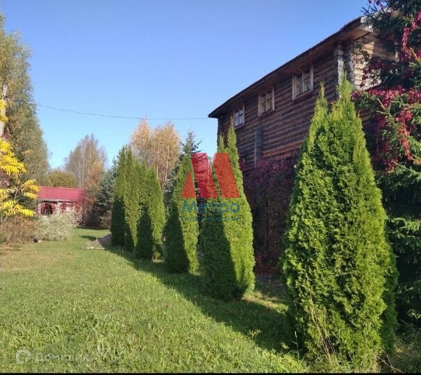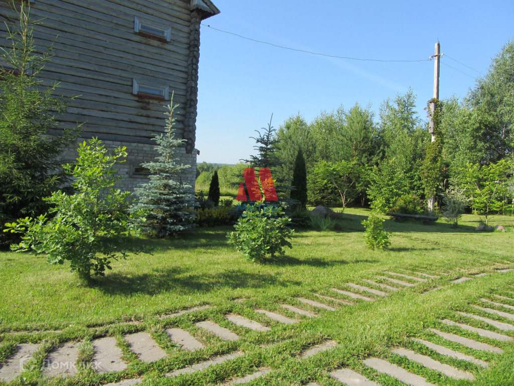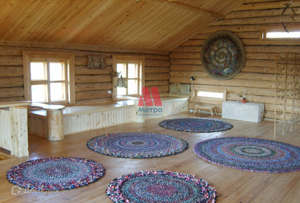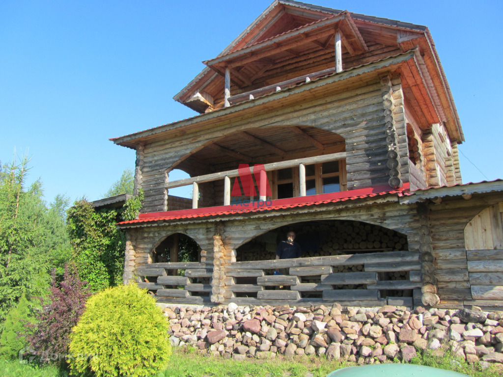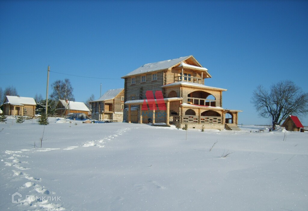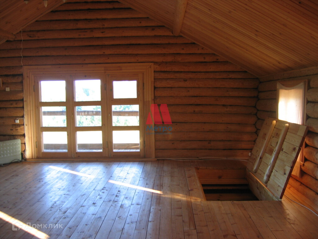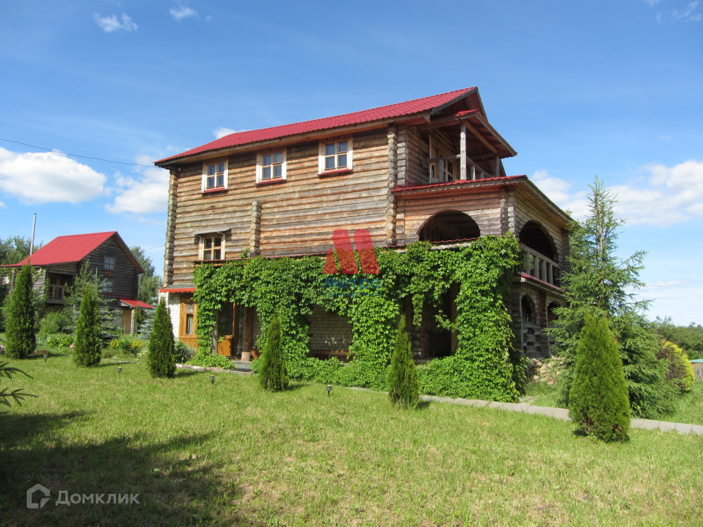 Состоит из трех этажей, материал стен бревно.
