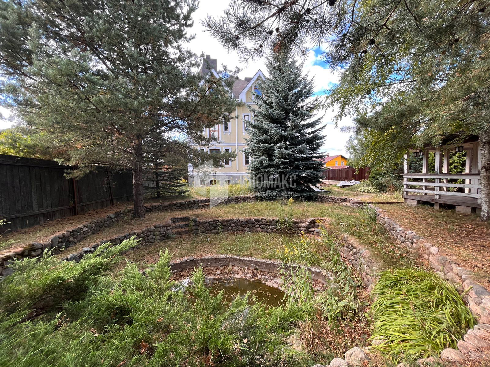 Забор по периметру участка, выполнен ландшафтный дизайн.